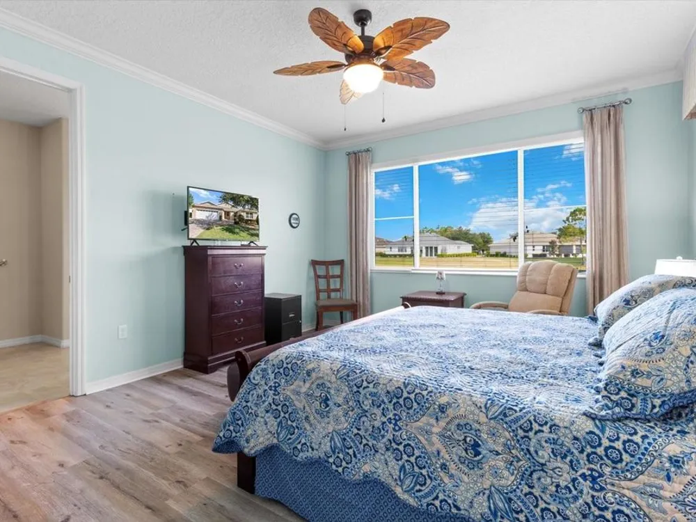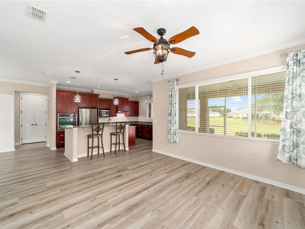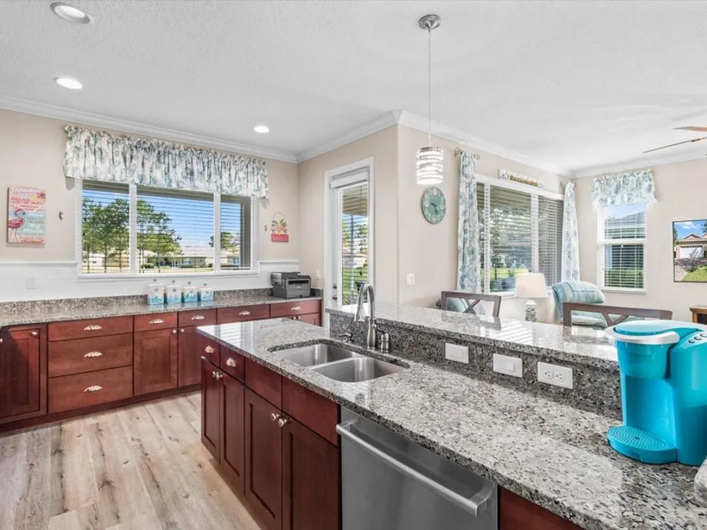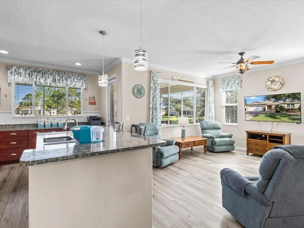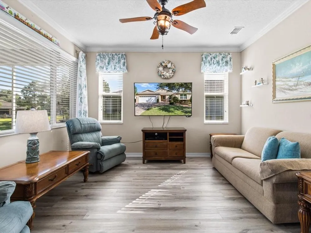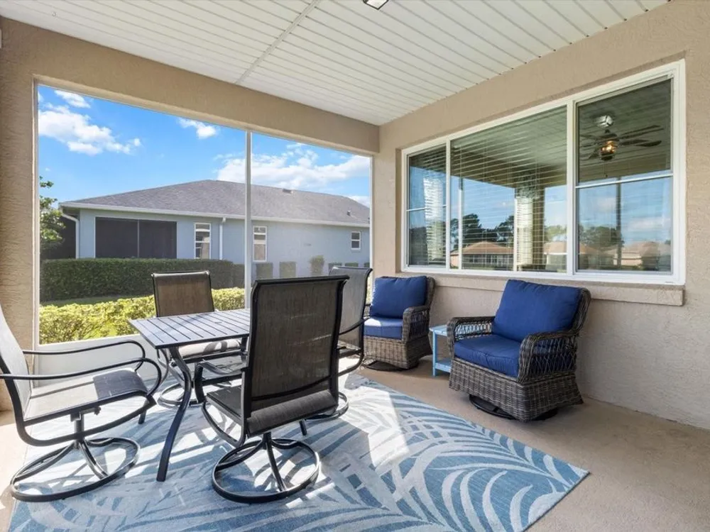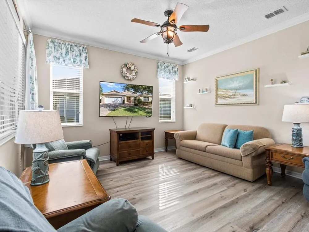 MOTIVATED SELLER, WILL ENTERTAIN ALL REASONABLE OFFERS!!! NEW PHOTOS ADDED! Welcome to this beautiful former model home located in the coveted neighborhood of Windsor West at On Top of the World, centrally located near the Arbors, the Rec Center and the soon to come Summit. This York model is beautifully landscaped and has great curb appeal. Lightly lived in and owned by a seasonal snowbird, the property has been meticulously cared for. Located on a peaceful retention pond privacy lot, the perfect spot to enjoy your morning coffee and evening sunsets from the spacious screened-in lanai. This exceptional split 2 -bedroom, 2-bathroom home offers a flex room and 2 car garage with a golf cart setback. This lovely home boasts a wealth of features designed for both elegance and functionality. The open-concept floor plan provides the perfect place to entertain. Featuring a gourmet kitchen for the discerning chefs, offering a gas stove, built in wall oven, pull out shelves in bottom cabinets, solid surface counters, center island, beautiful, staggered cabinets with crown molding, a large pantry, tons of countertop space and cabinets for maximum storage. The home features tile and LVP flooring. The primary bedroom is large enough for a king-sized bed and a cozy sitting area; it has an oversized closet and an ensuite with separate vanity sinks and a large walk-in shower. This home is so thoughtfully planned that even the laundry suite is designed with space for extra storage and is large enough to use as a hobby room. The HVAC was replaced in 2024, and the house features a whole house water softener. Schedule your private showing today! On Top of the World is Ocala's premier gated 55+ active lifestyle community, brimming with amenities and featuring golf cart access to three shopping centers. Schedule your private showing today and discover your next chapter in comfort and style! Seller to offer $2,000 flooring credit at closing.