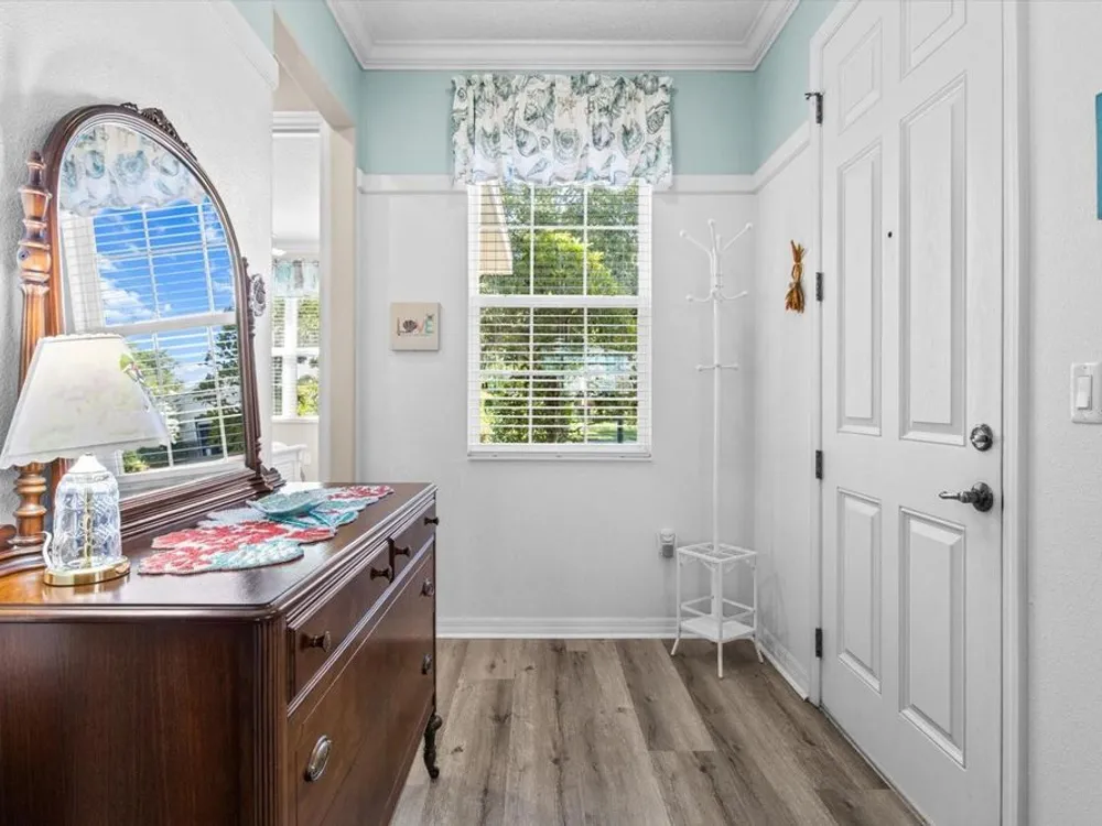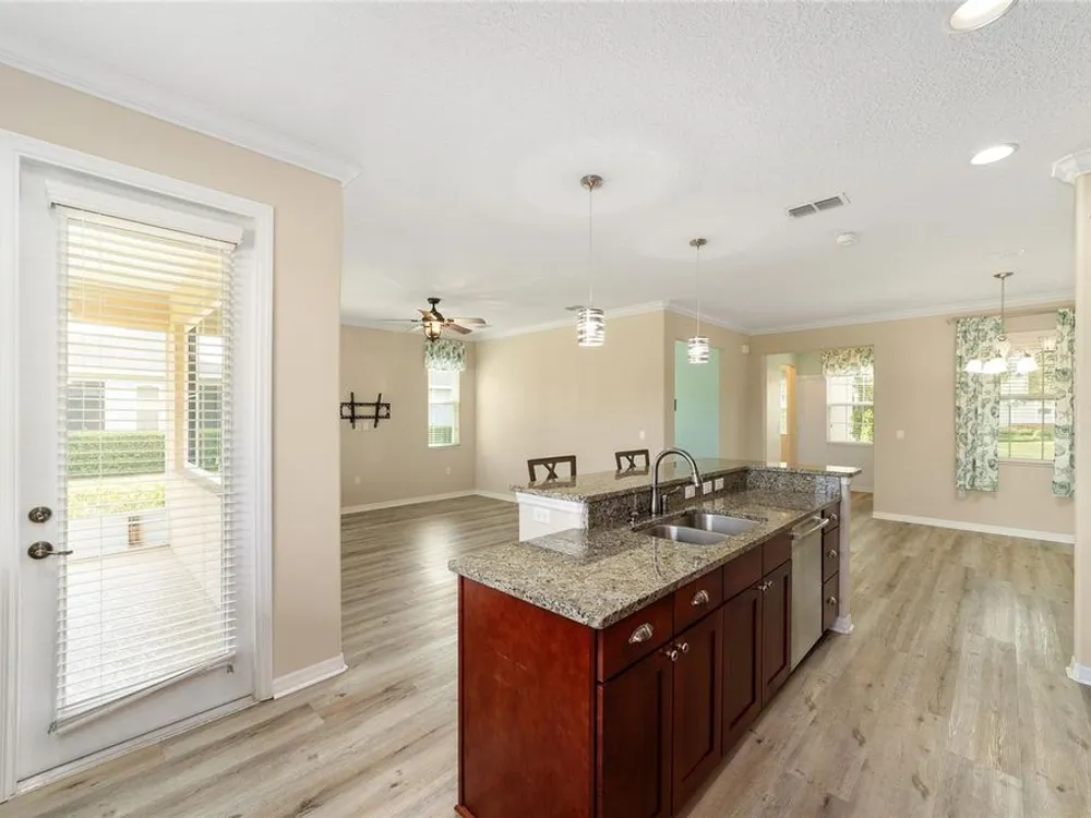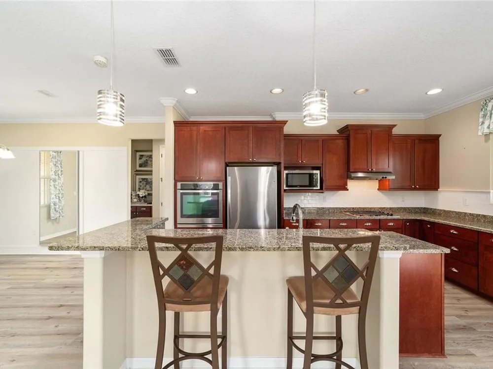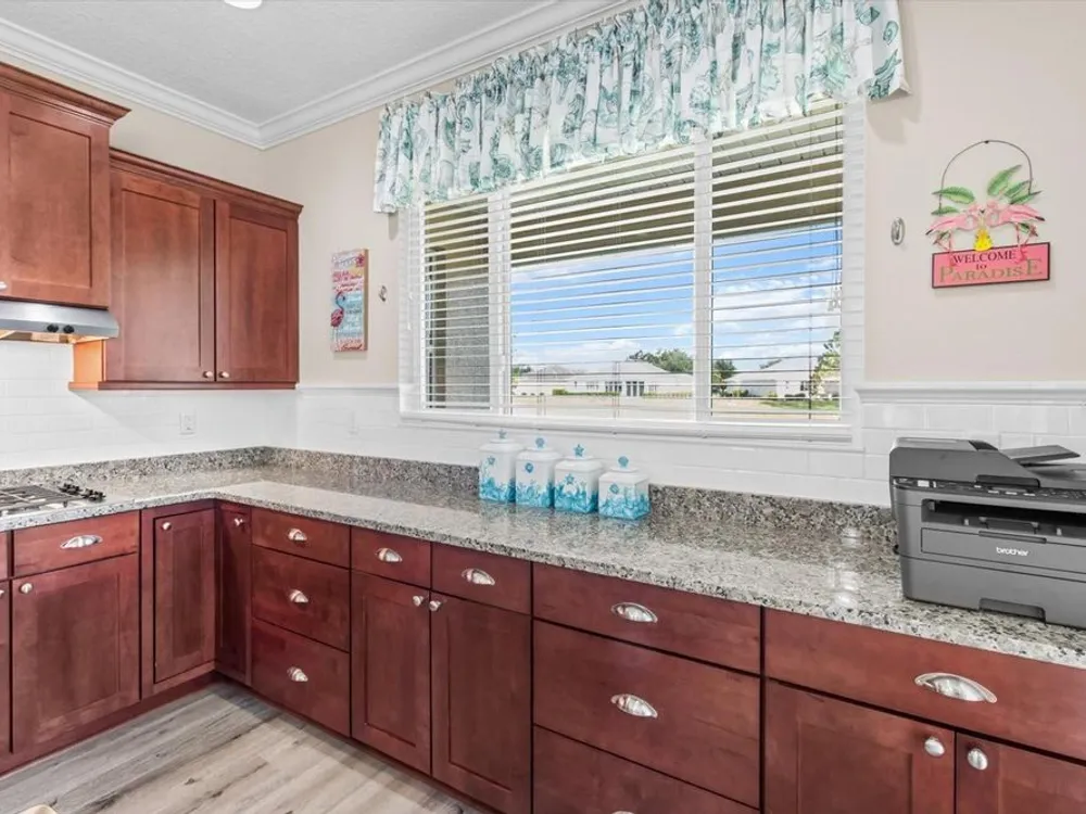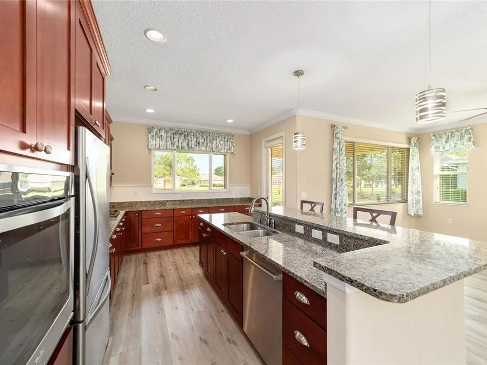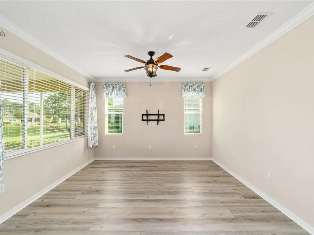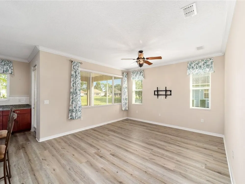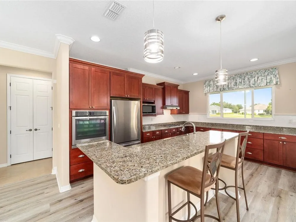 MOTIVATED SELLER, WILL ENTERTAIN ALL REASONABLE OFFERS!!! NEW PHOTOS ADDED! Welcome to this beautiful former model home located in the coveted neighborhood of Windsor West at On Top of the World, centrally located near the Arbors, the Rec Center and the soon to come Summit. This York model is beautifully landscaped and has great curb appeal. Lightly lived in and owned by a seasonal snowbird, the property has been meticulously cared for. Located on a peaceful retention pond privacy lot, the perfect spot to enjoy your morning coffee and evening sunsets from the spacious screened-in lanai. This exceptional split 2 -bedroom, 2-bathroom home offers a flex room and 2 car garage with a golf cart setback. This lovely home boasts a wealth of features designed for both elegance and functionality. The open-concept floor plan provides the perfect place to entertain. Featuring a gourmet kitchen for the discerning chefs, offering a gas stove, built in wall oven, pull out shelves in bottom cabinets, solid surface counters, center island, beautiful, staggered cabinets with crown molding, a large pantry, tons of countertop space and cabinets for maximum storage. The home features tile and LVP flooring. The primary bedroom is large enough for a king-sized bed and a cozy sitting area; it has an oversized closet and an ensuite with separate vanity sinks and a large walk-in shower. This home is so thoughtfully planned that even the laundry suite is designed with space for extra storage and is large enough to use as a hobby room. The HVAC was replaced in 2024, and the house features a whole house water softener. Schedule your private showing today! On Top of the World is Ocala's premier gated 55+ active lifestyle community, brimming with amenities and featuring golf cart access to three shopping centers. Schedule your private showing today and discover your next chapter in comfort and style! Seller to offer $2,000 flooring credit at closing.