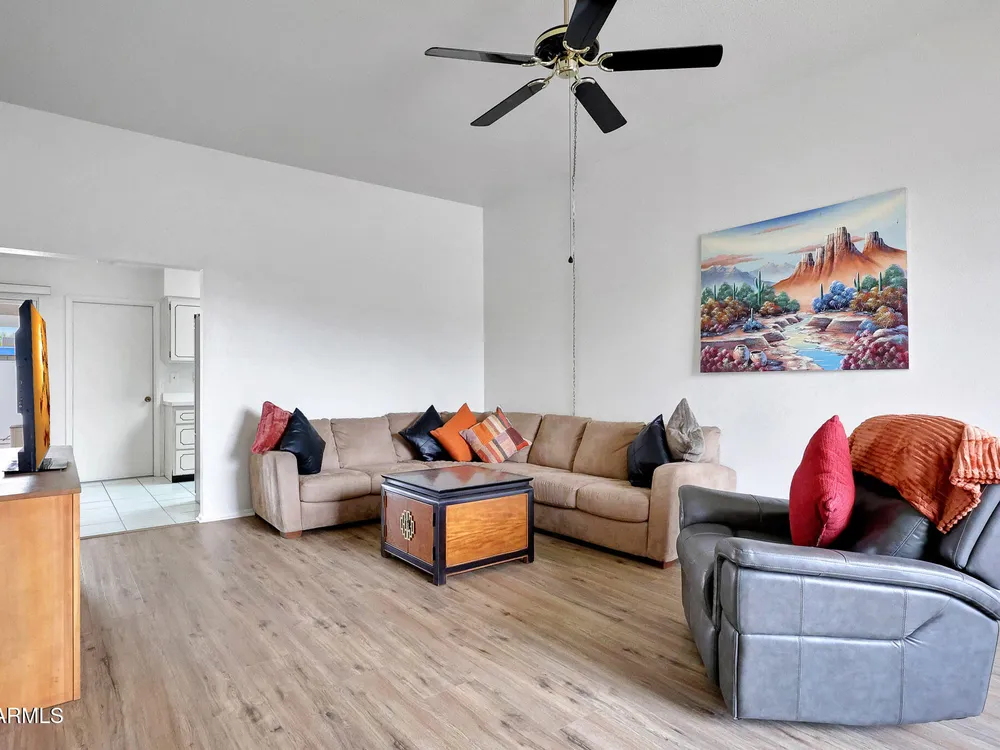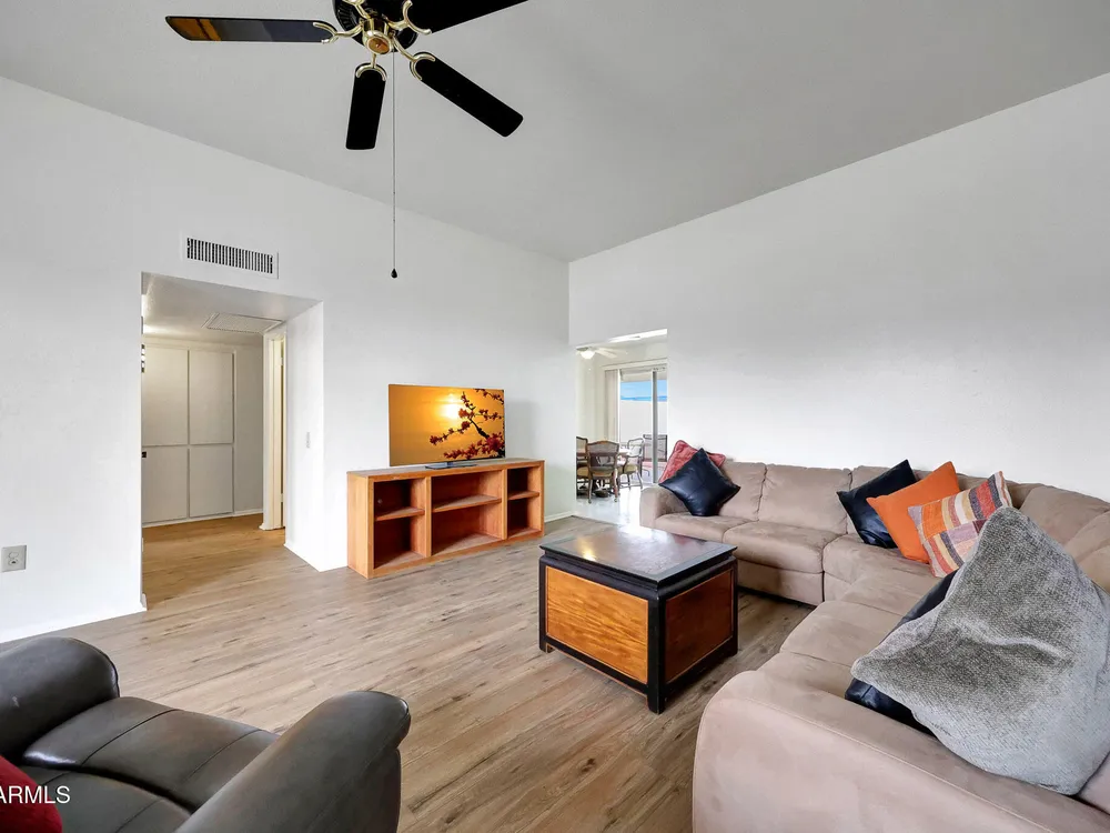 Welcome To This Charming GA201 Model Home In Sun City. It Is Move-In Ready And Waiting For You! This Delightful Residence Features Soaring Ceilings In The Living Room, Creating An Open And Airy Atmosphere. Both Bedrooms Are Generously Sized, Offering Plenty Of Space And Comfort. Recent Updates Include Fresh Interior Paint, Stylish Vinyl Plank Flooring In The Main Living Areas, And Cozy Carpet In The Bedrooms. The Kitchen Has Been Refreshed With A Recent Stove And Hood Vent Instalation, Making It Both Functional And Modern. Enjoy Peace Of Mind With A Newer HVAC System Installed In 2020 And A Water Heater That's Just 2.5 Years Old. Step Through The Sliding Glass Door To A Fully Enclosed Back Patio. Perfect For Relaxing Or Entertaining Year-Round. The Home Also Includes An Oversized One Car Garage