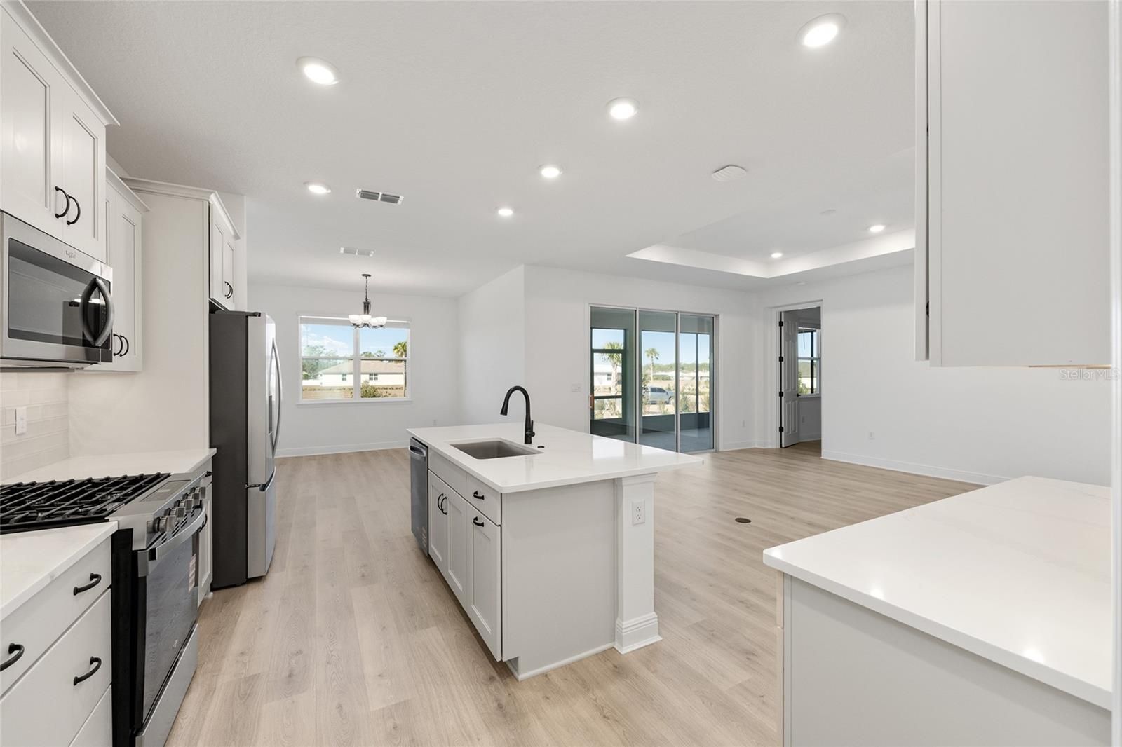 Welcome to the Livingston, a new construction home that flawlessly combines open-concept luxury with peaceful privacy. This meticulously designed home features 2 bedrooms, 2 baths, and an expansive living area that serves as the heart of the residence. The gourmet kitchen is a chef's dream, showcasing a massive quartz island, elegant shaker cabinetry, and premium stainless-steel appliances, all anchored by a light-filled Breakfast Area. For those seeking a quiet retreat, the Flex Room—enclosed by classic French doors—offers a sophisticated space for a home office or library. The sanctuary continues in the Primary Suite, where you will find a luxurious master bathroom designed for relaxation. It features a sprawling dual-sink vanity with modern black fixtures and a stunning walk-in shower finished with floor-to-ceiling tile work and a built-in bench. Throughout the home, tray ceilings and luxury vinyl flooring enhance the airy, spacious feel. Step through the sliding glass doors to the Covered Lanai and enjoy the ultimate Florida luxury: no rear neighbors, providing a serene backdrop for outdoor living. Practicality meets style with a generous Laundry Suite and a 2-car garage that includes a dedicated golf cart space. From the welcoming Covered Porch to the high-end finishes in every room, the Livingston is the perfect blend of comfort and class. On Top of the World Communities in Ocala has unmatched amenities, over 21 miles of walking trails, fitness programming, weekly entertainment, lifelong learning, golf, 175+ resident clubs and more.