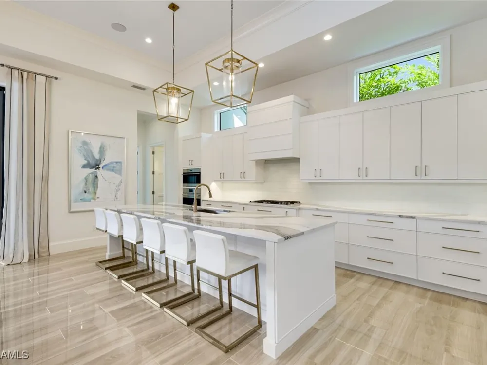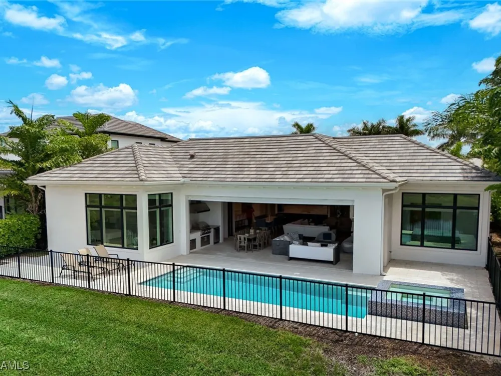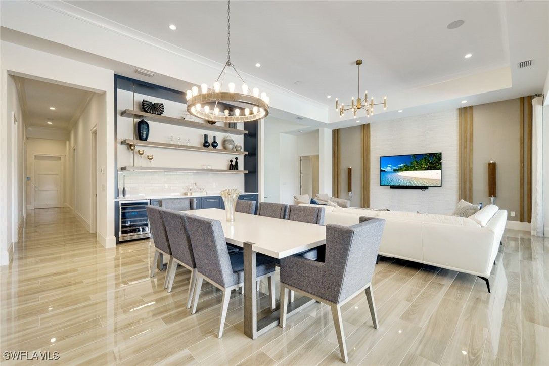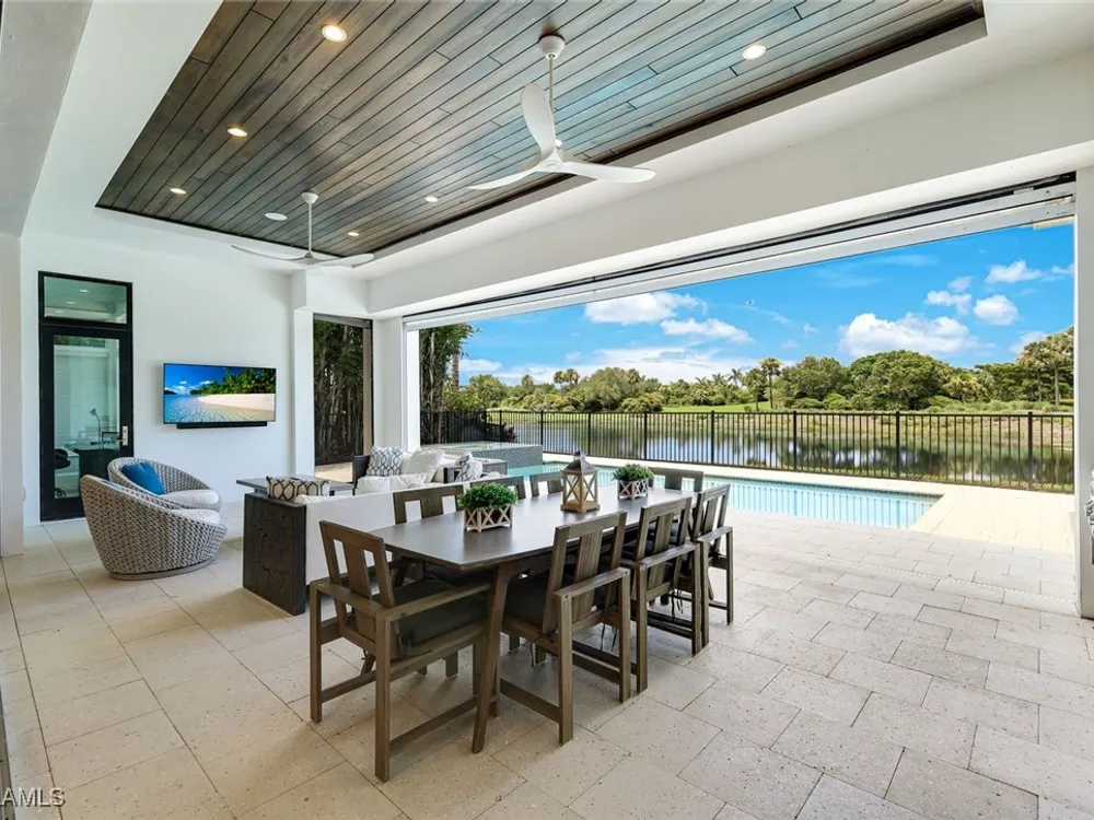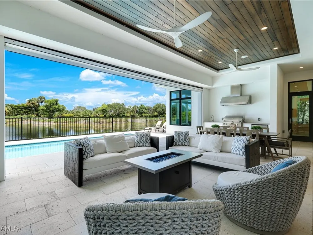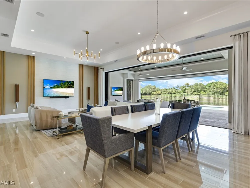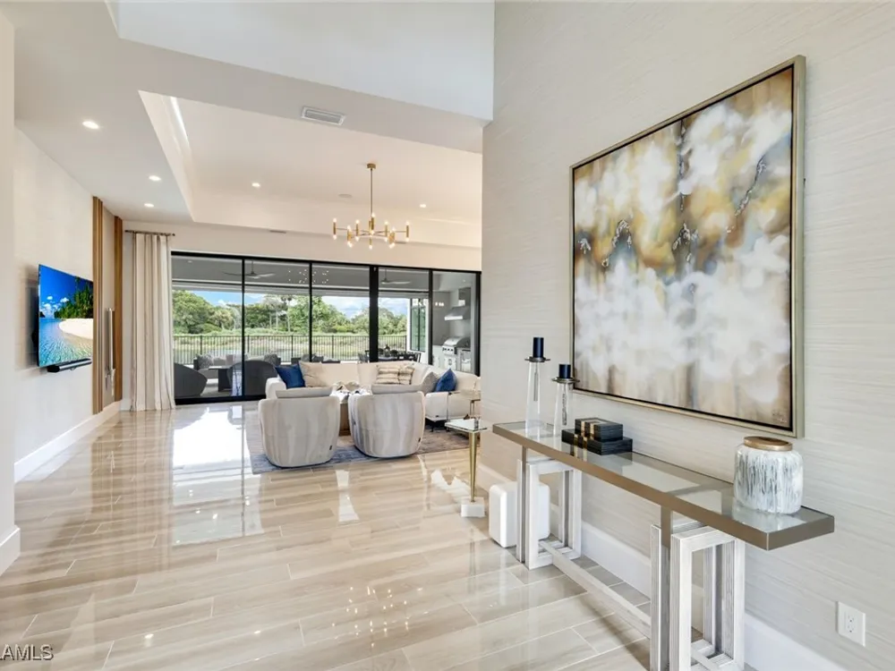 IMMEDIATE FULL GOLF MEMBERSHIP! Designer curated 4 bedroom, 4½ bath home within the exclusive enclave of The Peninsula in Treviso Bay. Easily entertain in the living area with custom beverage bar and retractable sliders which seamlessly blend the inside and outdoor spaces. “Everyone gathers in the kitchen” around the enormous center island which seats 6! Culinary creations are easy with the Wolf gas cooktop, wall ovens and large walk-in pantry. The primary suite rivals a boutique hotel with a poolside sitting room/office plus custom walk-in closets. The bath is spa-like and boasts dual vanities, a walk-around shower, dual shower heads and custom niches. Guests have their choice of bedroom suites, each with oversized closets and designer baths. The lanai is expansive with outdoor kitchen. The pool and spa are sun-drenched with water-to-golf views. Oversized 3 car garage, custom wood details, large beverage bar, electric storm screens plus designer wallpaper and lighting. This special home is walking distance to the Treviso Bay golf clubhouse. Full golf membership is immediate and without the heavy buy-in that other memberships require. In addition, members have exclusive access to TPC golf courses worldwide. Multiple dining options plus an extensive calendar of gatherings complete your Treviso Bay lifestyle. Beyond the privacy of Treviso Bay is the renowned dining and shopping of Naples and Marco Island. This home is very special offering and sold beautifully furnished.