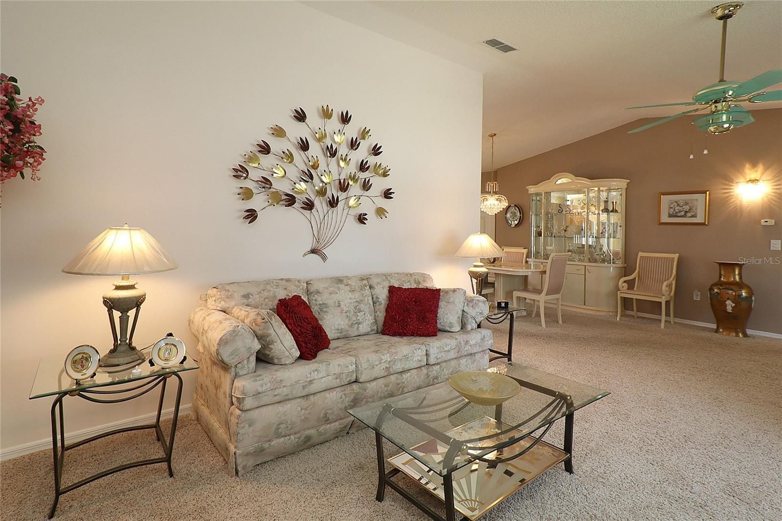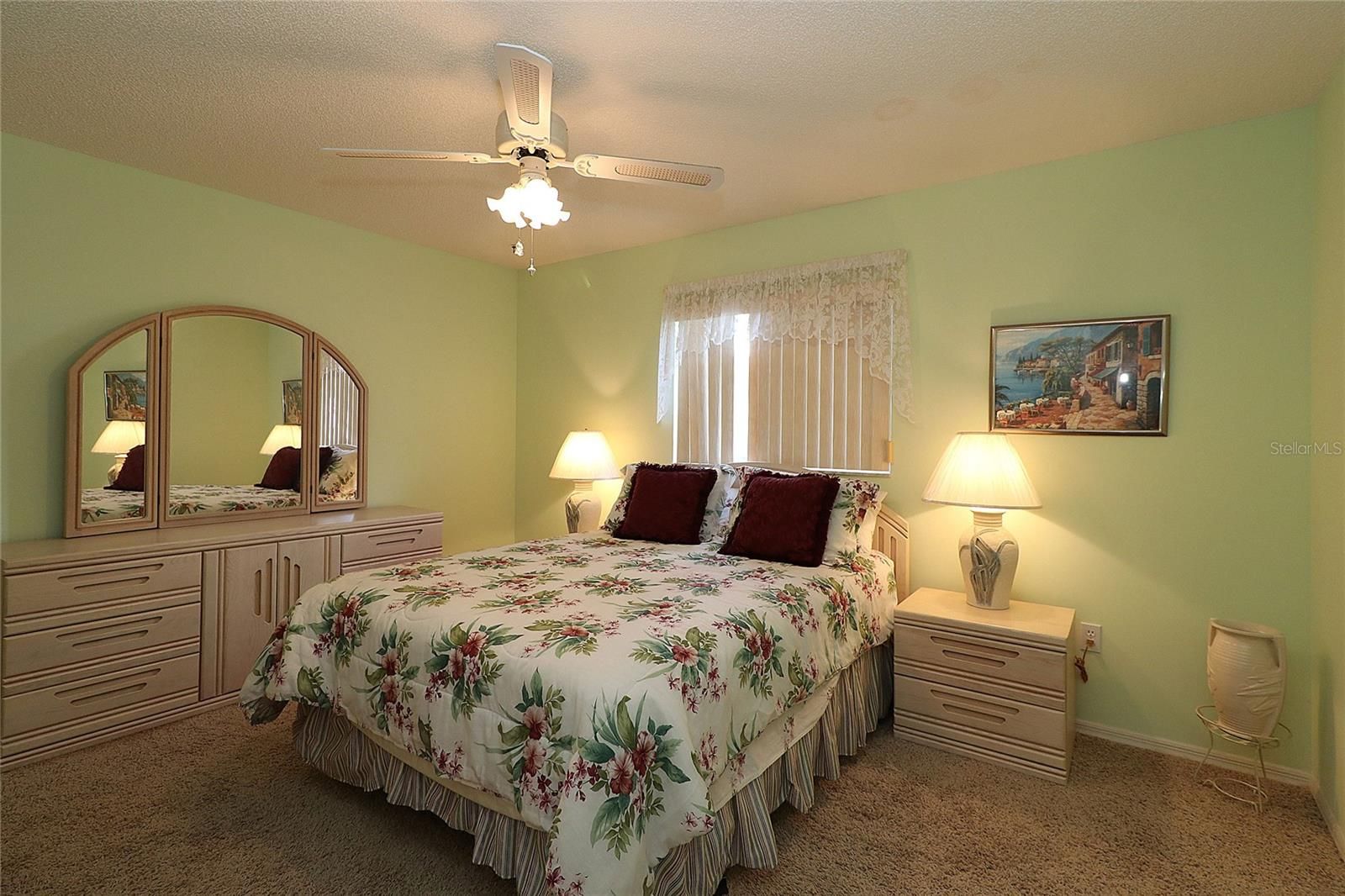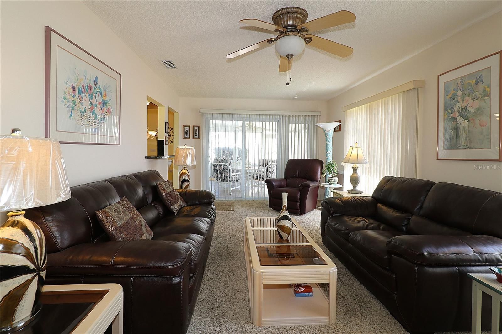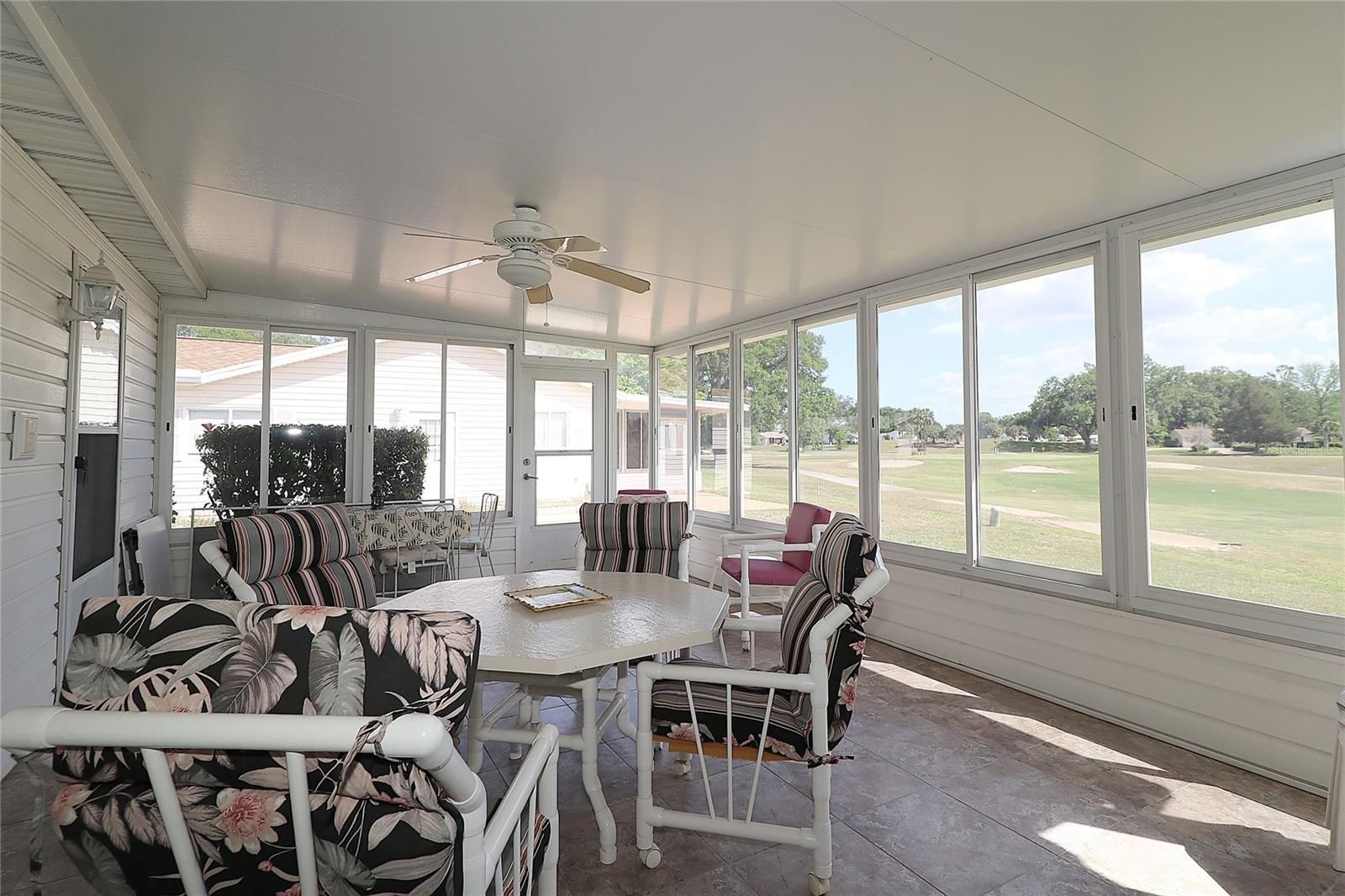 JUST REDUCED AGAIN.. If you do not want to live in The Villages, but be close by, Spruce Creek South may be the perfect place for you. This home is a Palm II on the golf course with a pond view and a view of the Links Lighthouse. This beautiful home is a 2 bedroom home with a enclosed lanai and a Florida Room and is being sold TURNKEY. Spruce Creek South has its own golf course, pro shop and restaurant. There is also a pool. It is a gated community and very close to lots of shopping, medical, restaurants and more. The enclosed lanai has a table and chairs and more furniture in case you are entertaining. The Florida room has two sofas and a tv stand and tv. There is also a formal living room. Remember this home is turnkey and has everything you need, so just bring your suitcase and move right in. There is a laundry room and a desk in the room for an office. Off of the laundry room is the garage. The two car garage has a sliding screen and pull down steps to a storage area. The owner also left some nice cabinets for storage and more. The kitchen has a nook area with table and chairs and granite counters and a glass top range. This is an all electric home. Off of the kitchen is the dining room with plenty of room for guests. The table and chairs is enough for 6 guests or more. The Primary bedroom has a King size bed and two nightstands and a chest. The Primary bathroom is spacious and has granite counters and a nice tiled shower. Enjoy the large walk-in closet. The Guest bedroom has a Queen bed and two night stands and a armoire and a dresser. The guest bathroom has granite counters and a tub and shower combo. There is a nice built in closet in this room. As you come into the front door of this home you see the formal living room. This entire home is carpeted except for the lanai and the wet areas. The large window in the formal living room lets in wonderful light. This home is on a cul-de-sac so there is very little traffic. Enjoy the Florida lifestyle in this lovely home. Taxes $3,985.35, Sp Asmt. $301.95 year, HOA $70.35 month. NO BONDS.