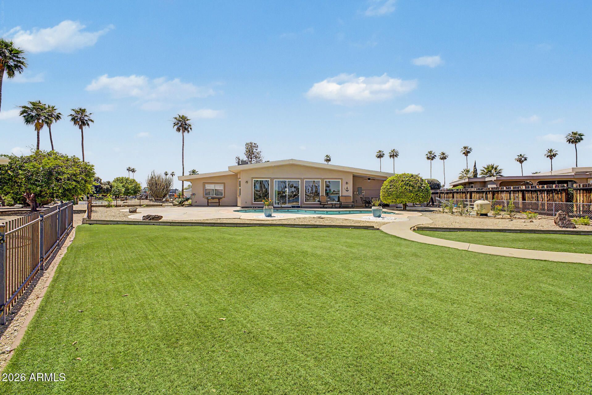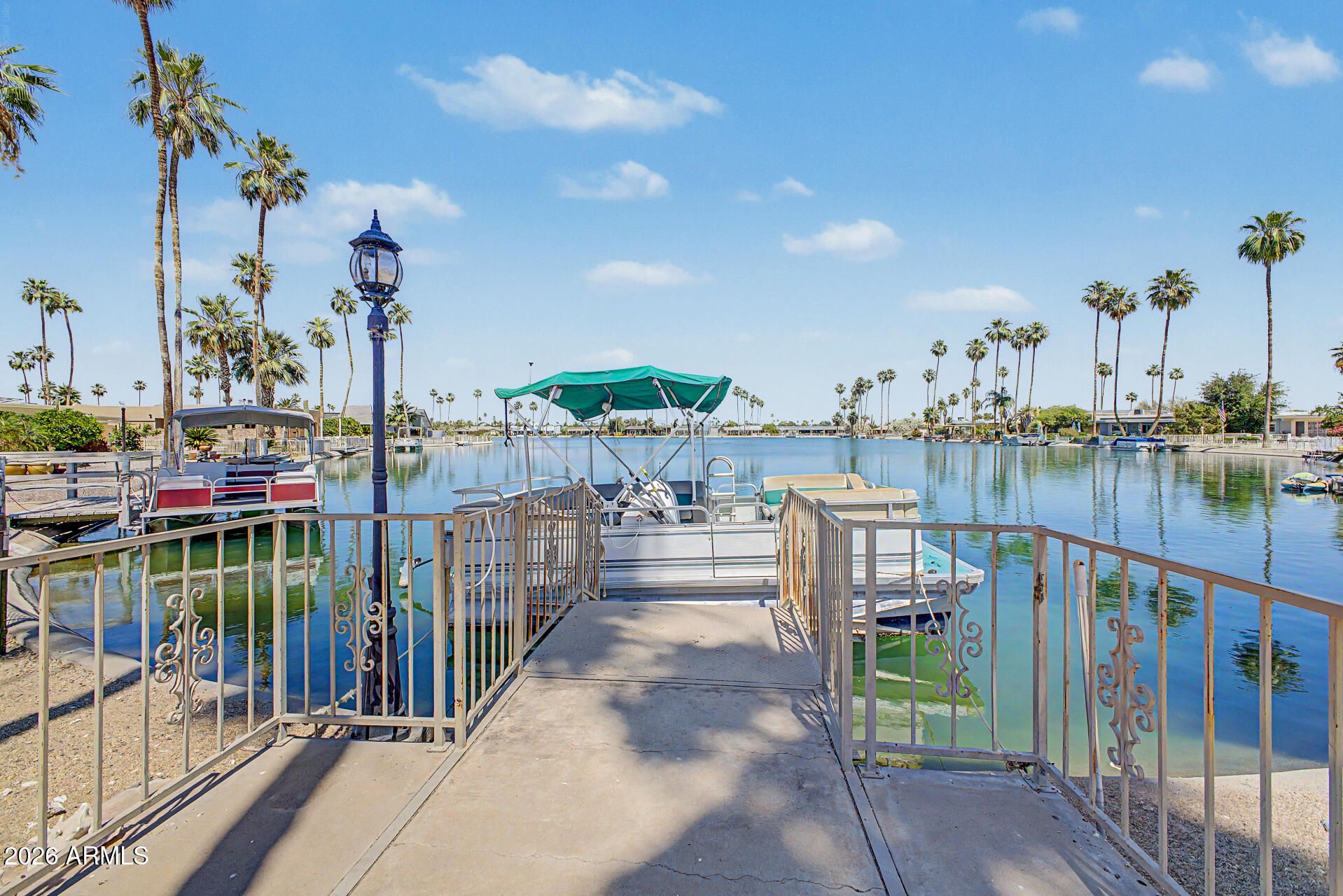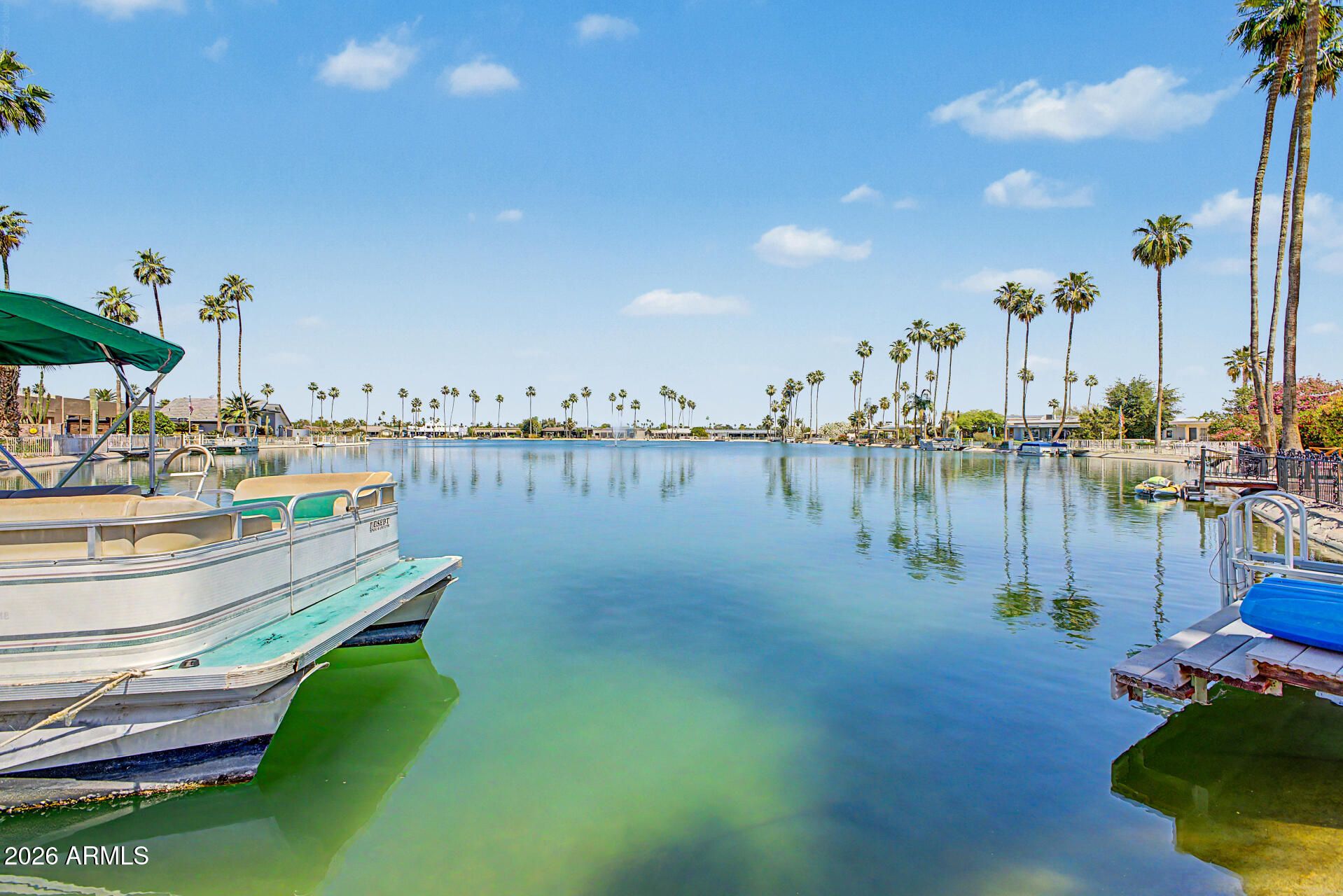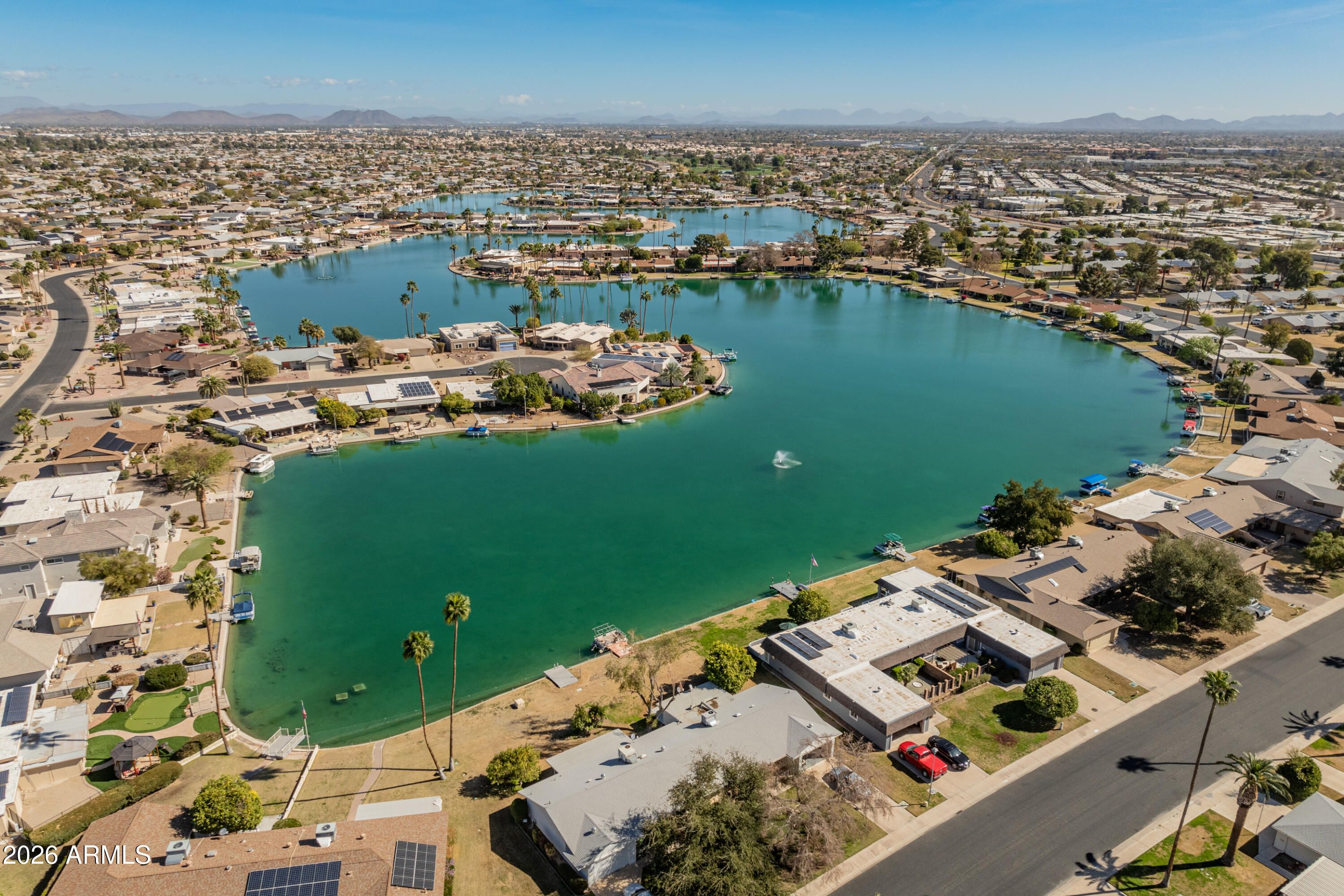Welcome to one of Sun City's most coveted hidden treasures: Dawn Lake. This exceptional lakefront property has been completely reimagined to offer the perfect blend of luxury, comfort, and active adult living. Set on a sprawling corner lot, the home features a resort-style pool and a massive three-car garage, delivering both elegance and outstanding functionality. This upgraded 2-bedroom, 2-bath residence is ideal for those seeking breathtaking scenery, peaceful privacy, and a vibrant lifestyle. The premium waterfront setting captures sweeping views of the lake, palm trees, and distant mountains--creating a stunning backdrop from sunrise to sunset. A private dock invites quiet mornings by the water and unforgettable evenings with shimmering reflections and serene surroundings. The expansive lot provides endless potential for outdoor living and future enhancements, while the pool transforms the backyard into a private oasis perfect for relaxing or entertaining under the Arizona sun. Inside, the home offers a bright, open layout with effortless flow between living spaces. Thoughtful touches, and low-maintenance landscaping, add charm and ease to everyday living. The oversized three-car garage offers abundant space for vehicles, storage, and a golf cart--making it easy to enjoy Sun City's extensive golf cart pathways and nearby amenities. Dawn Lake is more than a neighborhood--it's a lifestyle. Residents enjoy a close-knit community with social events, recreation, and convenient access to shopping, dining, golf, and more. This is more than a home--it's a sanctuary. A rare opportunity to enjoy lakefront living with space, style, and the very best of Arizona beauty.