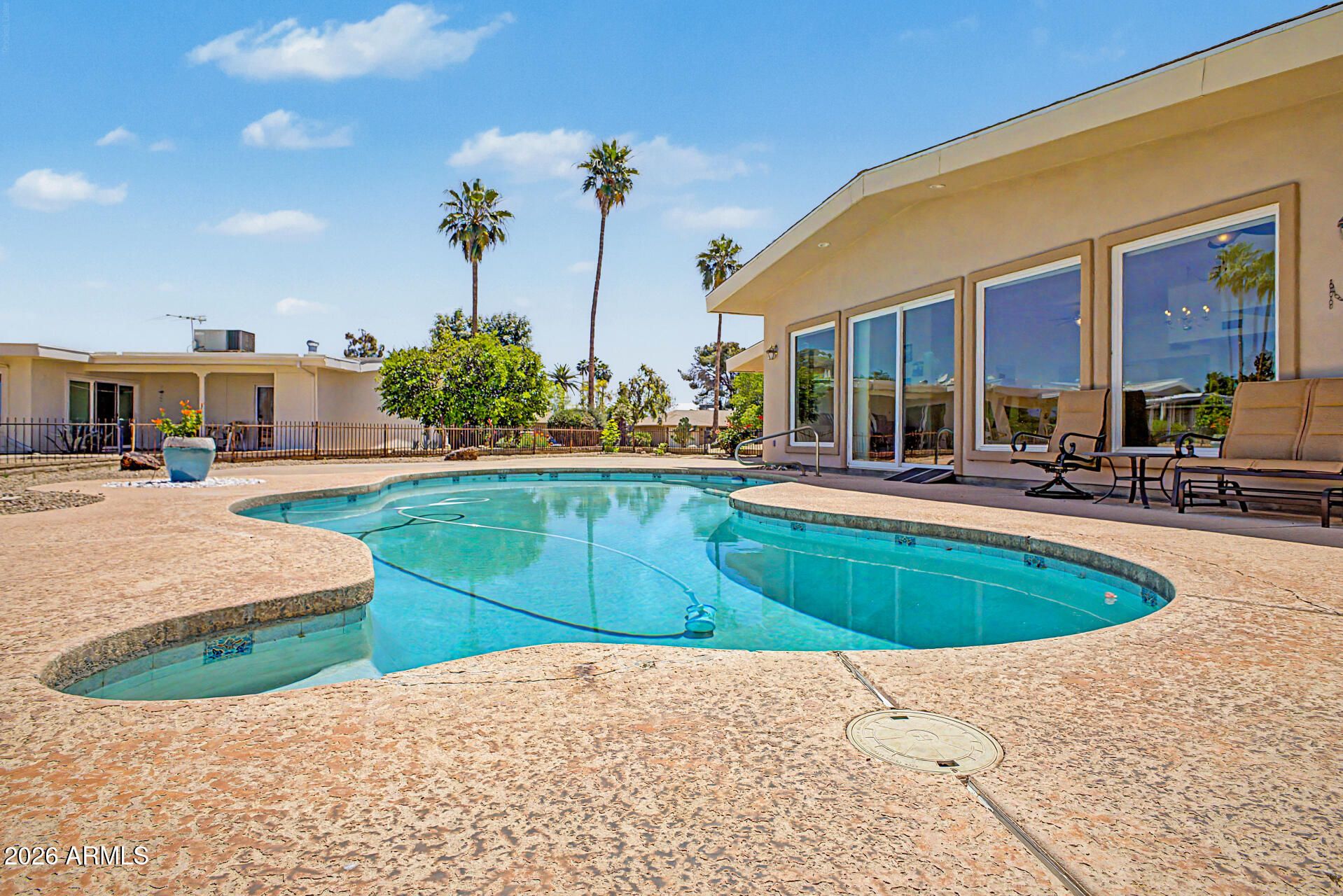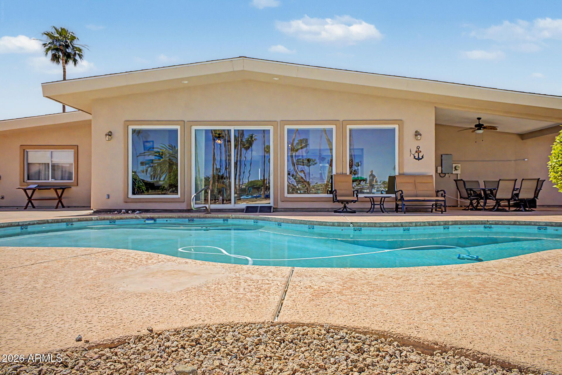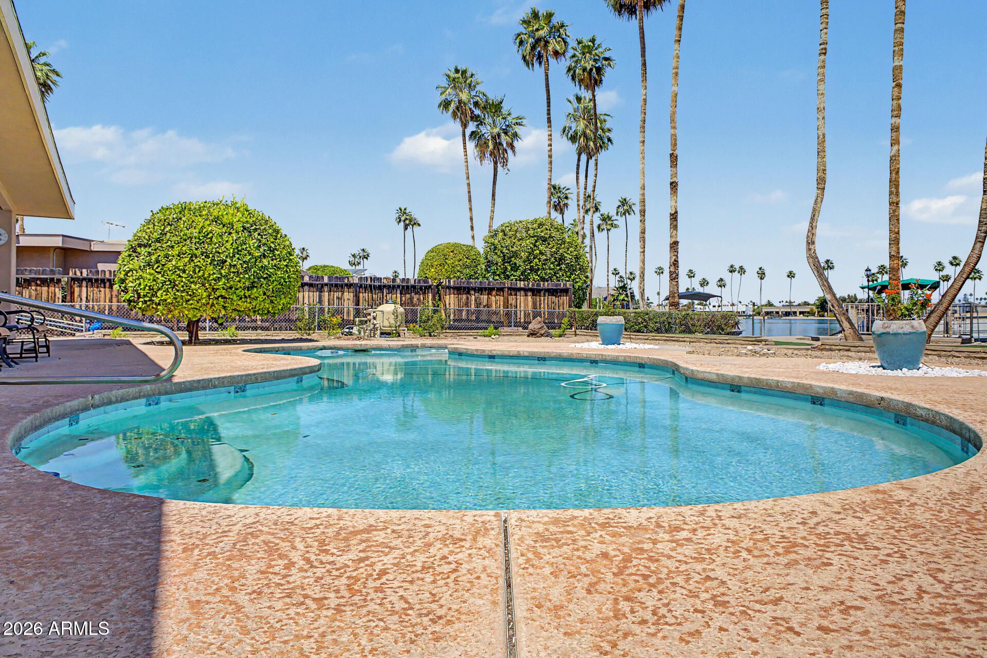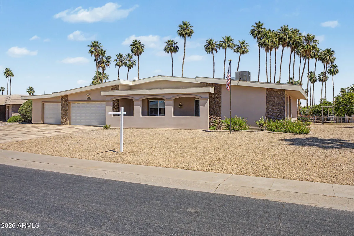 Welcome to one of Sun City's most coveted hidden treasures: Dawn Lake. This exceptional lakefront property has been completely reimagined to offer the perfect blend of luxury, comfort, and active adult living. Set on a sprawling corner lot, the home features a resort-style pool and a massive three-car garage, delivering both elegance and outstanding functionality. This upgraded 2-bedroom, 2-bath residence is ideal for those seeking breathtaking scenery, peaceful privacy, and a vibrant lifestyle. The premium waterfront setting captures sweeping views of the lake, palm trees, and distant mountains--creating a stunning backdrop from sunrise to sunset. A private dock invites quiet mornings by the water and unforgettable evenings with shimmering reflections and serene surroundings. The expansive lot provides endless potential for outdoor living and future enhancements, while the pool transforms the backyard into a private oasis perfect for relaxing or entertaining under the Arizona sun. Inside, the home offers a bright, open layout with effortless flow between living spaces. Thoughtful touches, and low-maintenance landscaping, add charm and ease to everyday living. The oversized three-car garage offers abundant space for vehicles, storage, and a golf cart--making it easy to enjoy Sun City's extensive golf cart pathways and nearby amenities. Dawn Lake is more than a neighborhood--it's a lifestyle. Residents enjoy a close-knit community with social events, recreation, and convenient access to shopping, dining, golf, and more. This is more than a home--it's a sanctuary. A rare opportunity to enjoy lakefront living with space, style, and the very best of Arizona beauty.