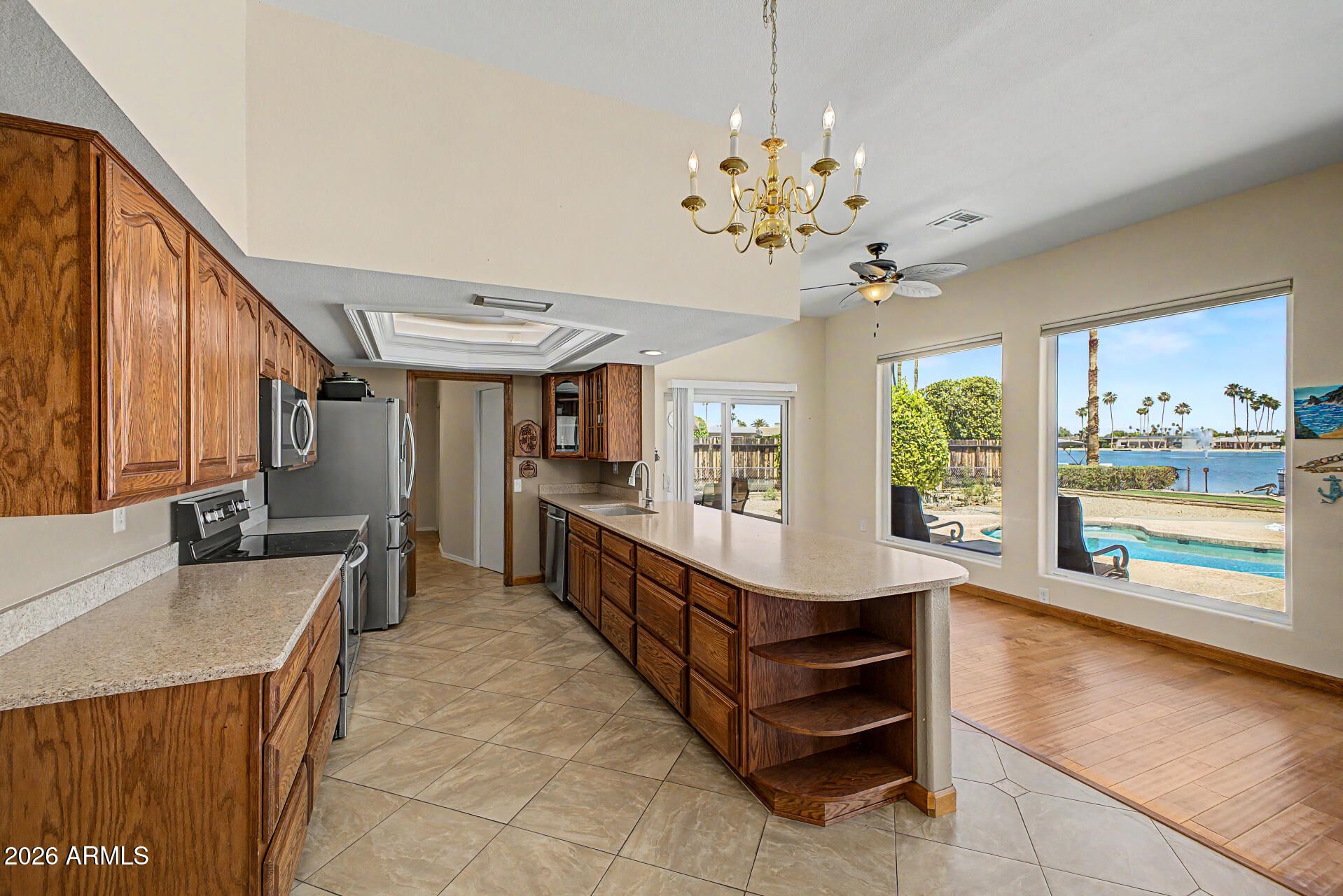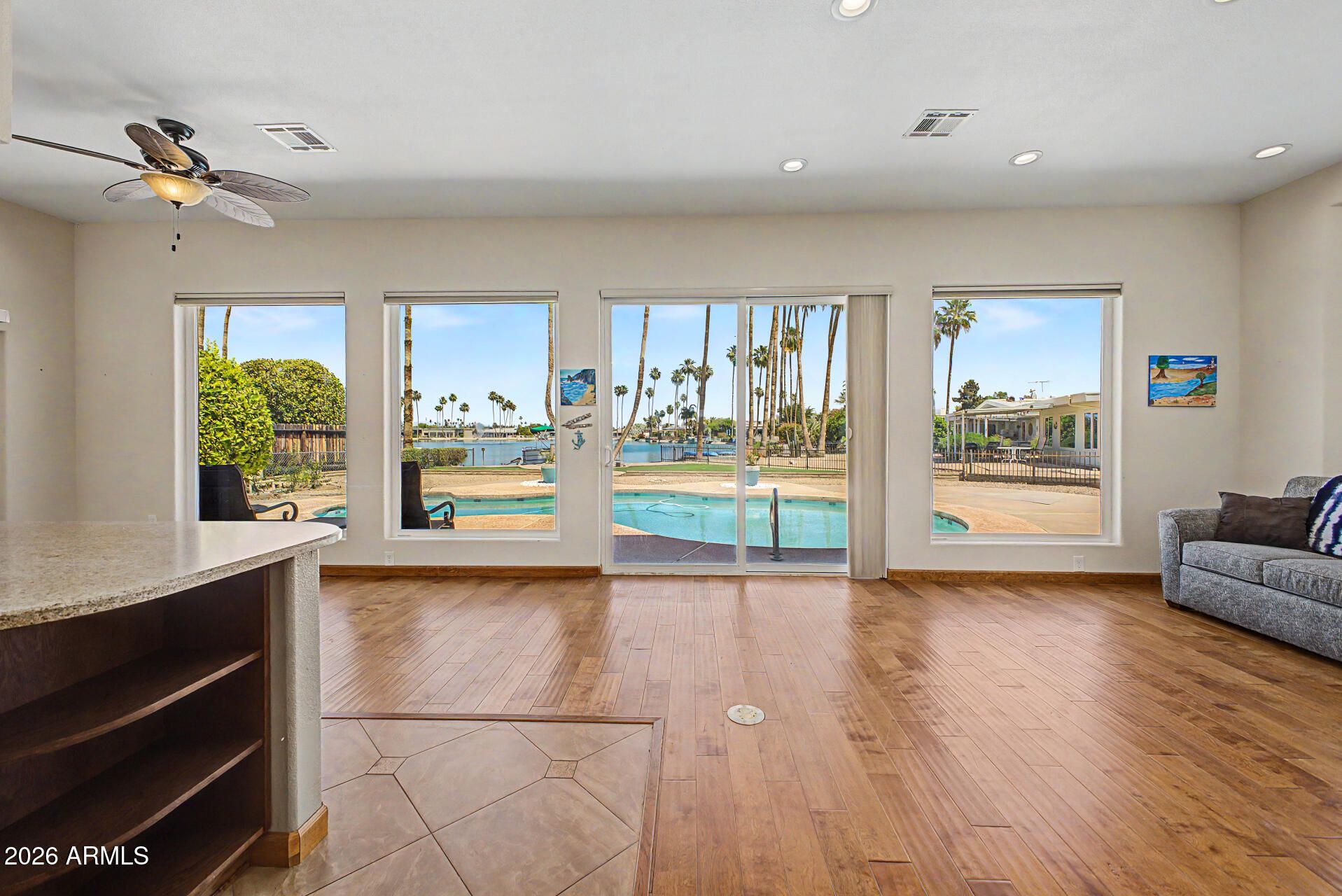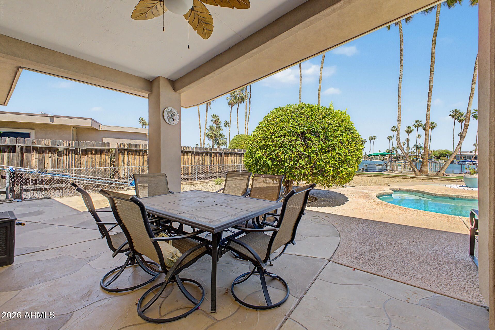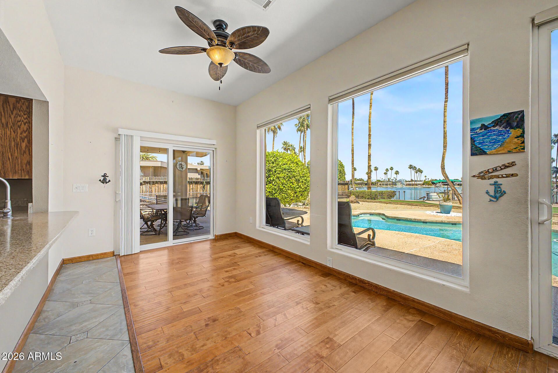 Welcome to one of Sun City's most coveted hidden treasures: Dawn Lake. This exceptional lakefront property has been completely reimagined to offer the perfect blend of luxury, comfort, and active adult living. Set on a sprawling corner lot, the home features a resort-style pool and a massive three-car garage, delivering both elegance and outstanding functionality. This upgraded 2-bedroom, 2-bath residence is ideal for those seeking breathtaking scenery, peaceful privacy, and a vibrant lifestyle. The premium waterfront setting captures sweeping views of the lake, palm trees, and distant mountains--creating a stunning backdrop from sunrise to sunset. A private dock invites quiet mornings by the water and unforgettable evenings with shimmering reflections and serene surroundings. The expansive lot provides endless potential for outdoor living and future enhancements, while the pool transforms the backyard into a private oasis perfect for relaxing or entertaining under the Arizona sun. Inside, the home offers a bright, open layout with effortless flow between living spaces. Thoughtful touches, and low-maintenance landscaping, add charm and ease to everyday living. The oversized three-car garage offers abundant space for vehicles, storage, and a golf cart--making it easy to enjoy Sun City's extensive golf cart pathways and nearby amenities. Dawn Lake is more than a neighborhood--it's a lifestyle. Residents enjoy a close-knit community with social events, recreation, and convenient access to shopping, dining, golf, and more. This is more than a home--it's a sanctuary. A rare opportunity to enjoy lakefront living with space, style, and the very best of Arizona beauty.