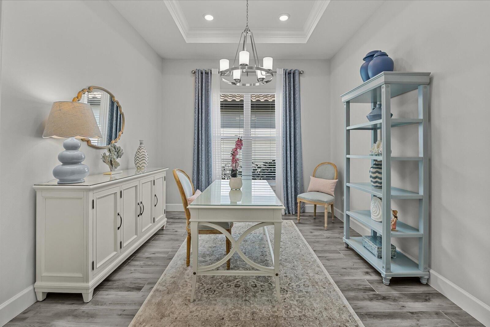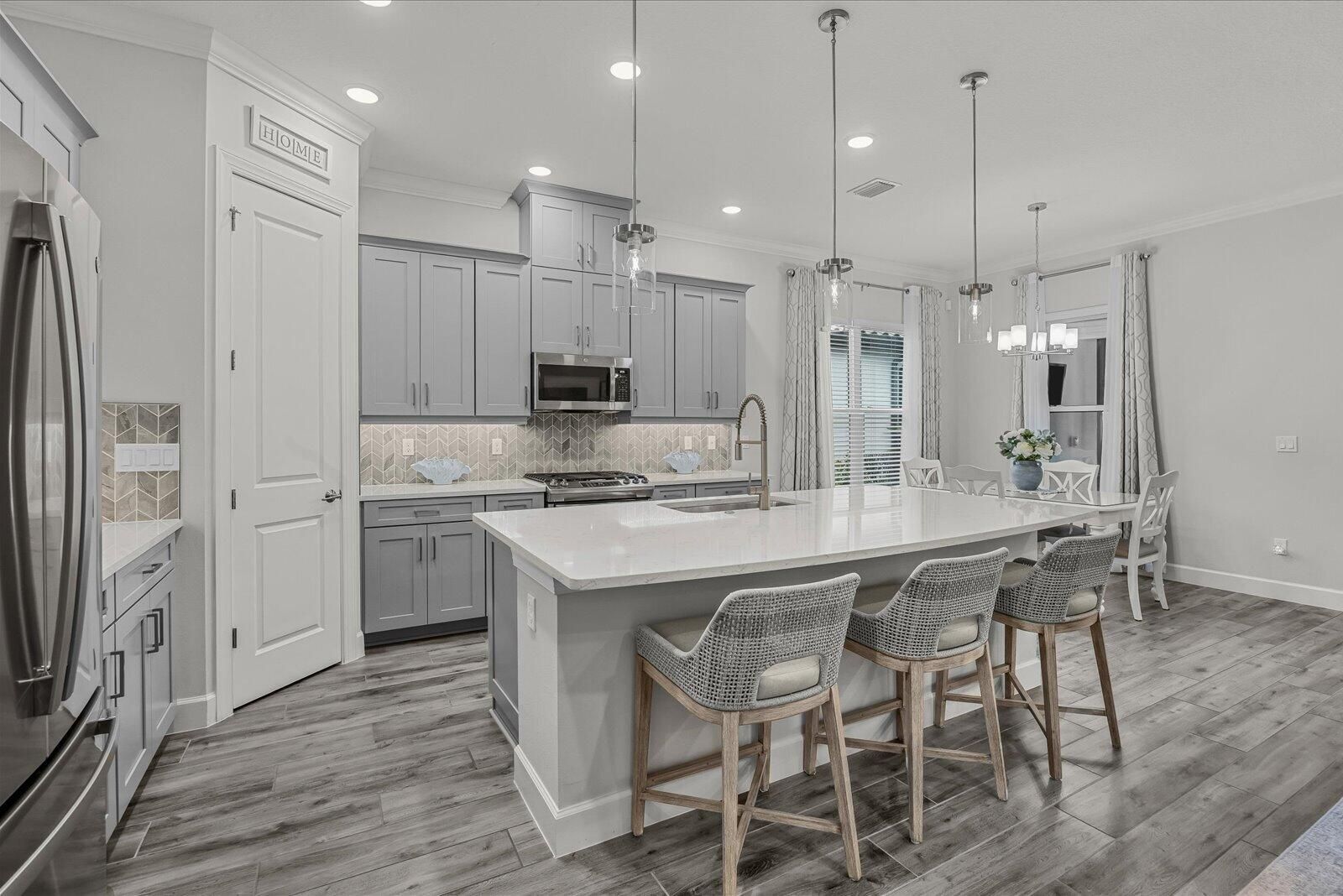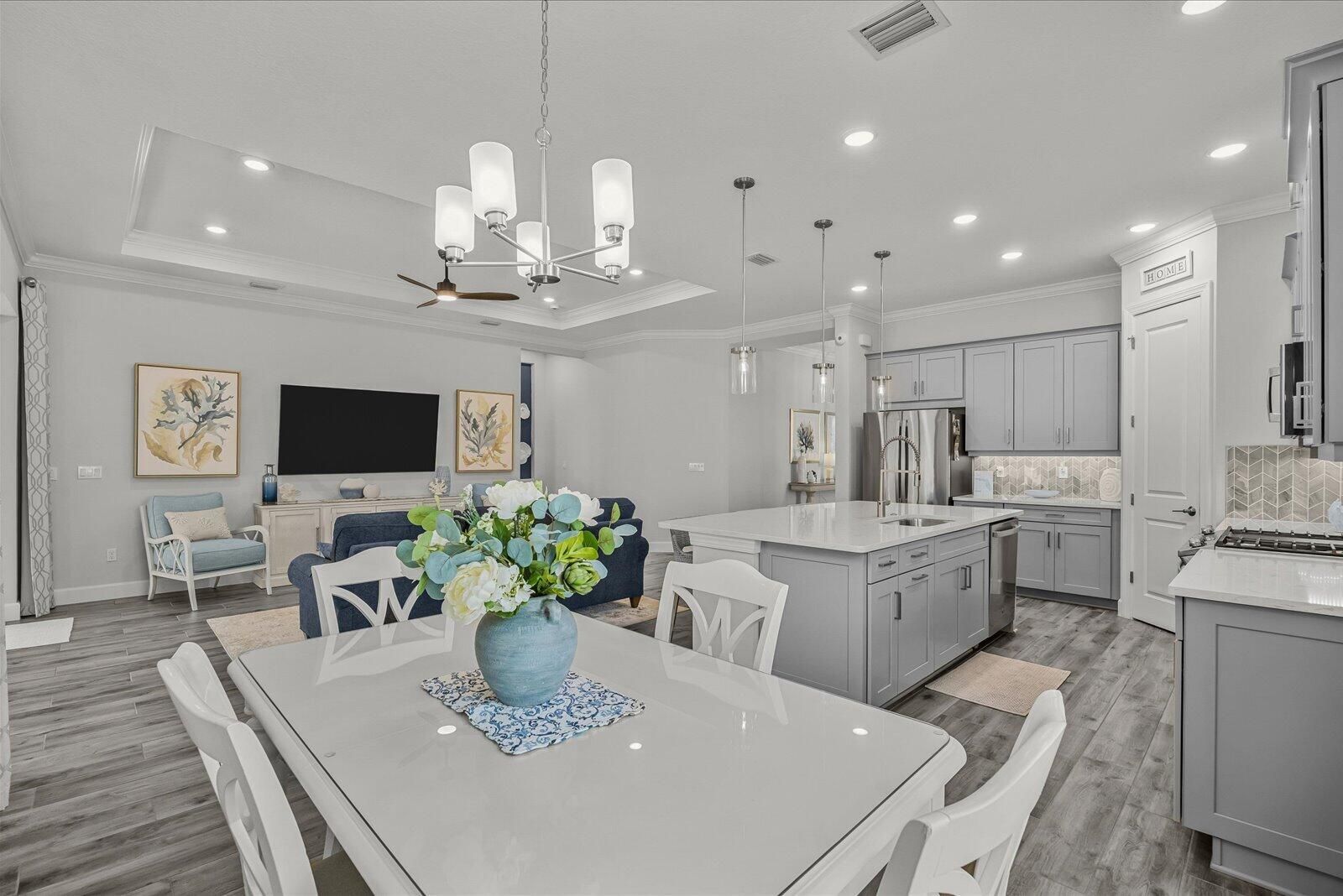 Presenting this Exquisite Custom Designed Lakefront Home in the Esplanade at Tradition! The Mediterranean- inspired architectural style offers an exceptional one-story layout that beautifully emphasizes the indoor and outdoor living spaces. Pride of ownership shines through & the attention to detail is unparalleled. The Gourmet Kitchen features GE Cafe Stainless Steel appliances with a GE Gas Range + a custom single basin, Quartz Countertops & 42" Cabinetry. The Interior features Full Impact windows, Sliders, an Impact glass front door, Crown moldings, 10' Volume/Tray Ceilings, 8"x 40" Porcelain Plank flooring, Custom blinds, Light fixtures & Ceiling fans + neutral paint tones to enhance the Coastal theme. The Large 595sq ft. Garage features tandem 3 car parking + Tank less water heater. An Oversized 420sq ft. Screened Lanai has pocket doors that fully retract for a true indoor & outdoor experience & offers serene views out to the Lake. A gas stub & water line are available for an Outdoor kitchen + oversized 7" gutters protect the foundation with buried down spouts. Privacy is ensured by fully Motorized Solar screens. Enjoy "La Dolce Vita" and live your life to the fullest! Luxury & sophistication combine to offer you an inviting oasis of leisure-focused resort amenities. The "Venue" is a state-of-the-art 16,800 sq. ft. premium amenity center showcasing the resort style pool, first class fitness center, a luxurious Spa, a grand community room, a catering kitchen, the Toasted Cafe, a large Veranda with alfresco dining & all surrounded by perfectly manicured gardens/landscaping.