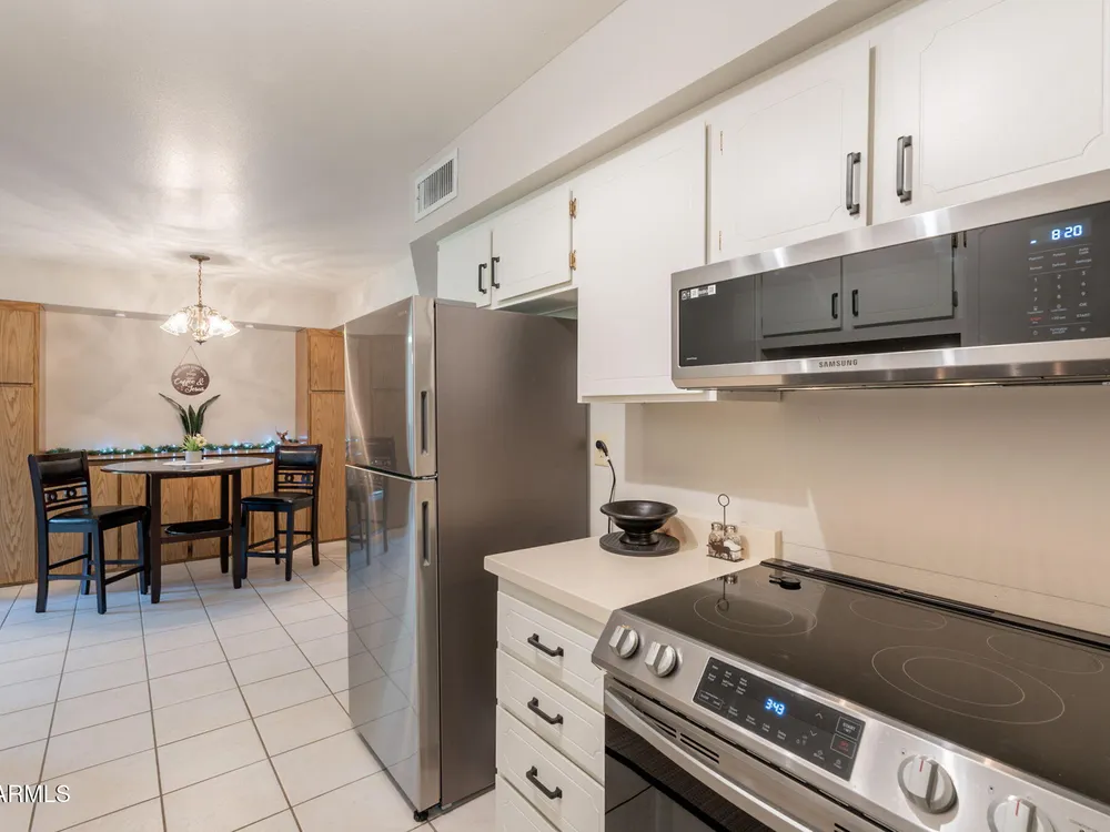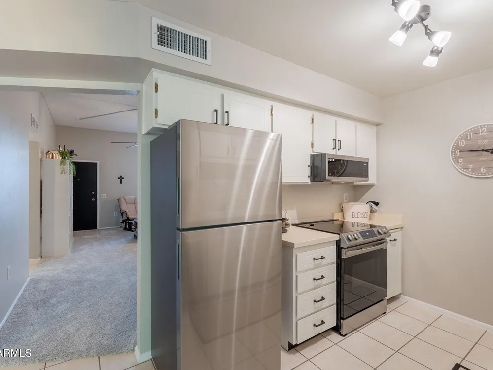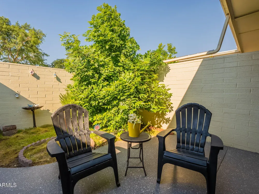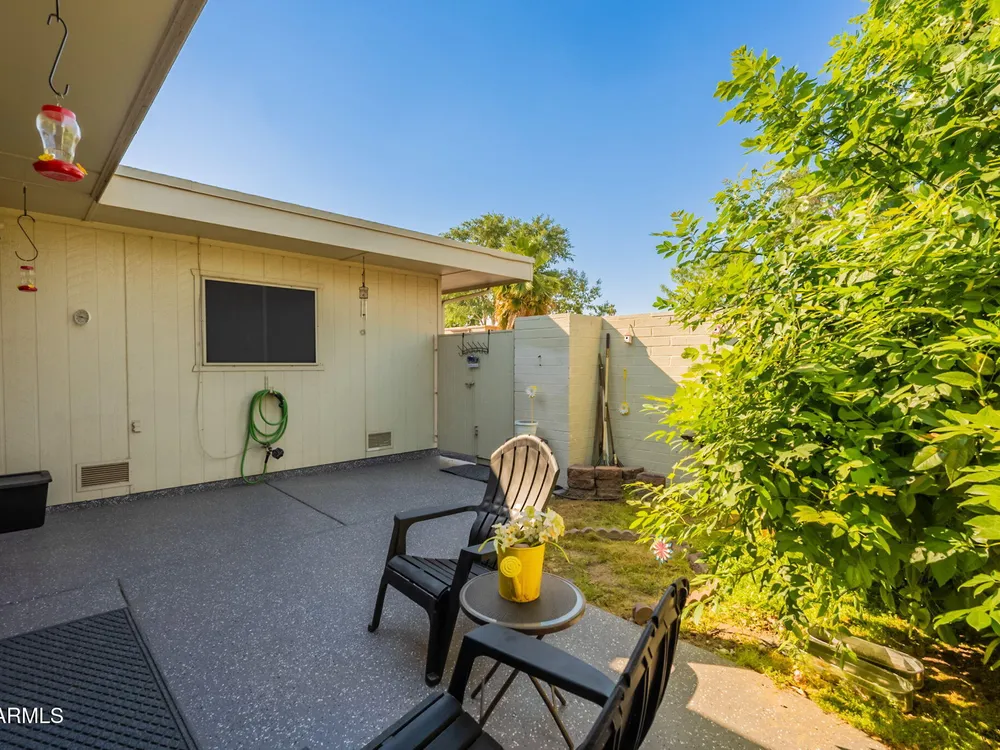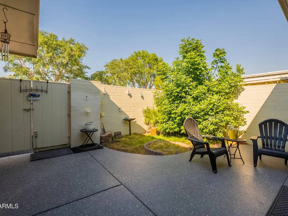 Welcome to this beautifully updated home featuring two bedrooms and two bathrooms. Thoughtful updates throughout make this residence truly move-in ready. The entire interior has been freshly painted in a warm and inviting color palette, complemented by plush new carpeting that adds comfort and style. The kitchen is equipped with brand-new stainless steel appliances, and all cabinets have been refreshed with new paint and modern hardware. Bathrooms feature new toilets and resurfaced showers and tub, offering a clean and updated feel. Enjoy energy efficiency and style with all new interior shutters and window coverings, as well as new exterior sunscreens to help keep the home cool during Arizona's sunny days. The new water heater provides added peace of mind, and both the patio and garage The patio and garage floors have been finished with durable epoxy coating. This home is perfect for those seeking a well-maintained and tastefully updated property in a desirable location.