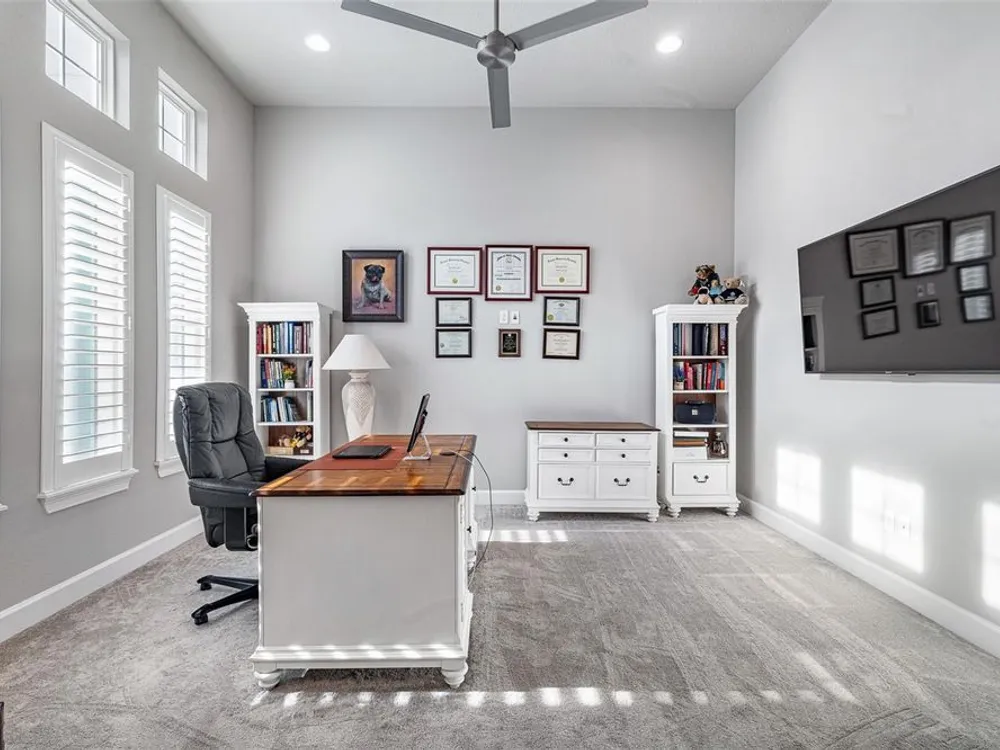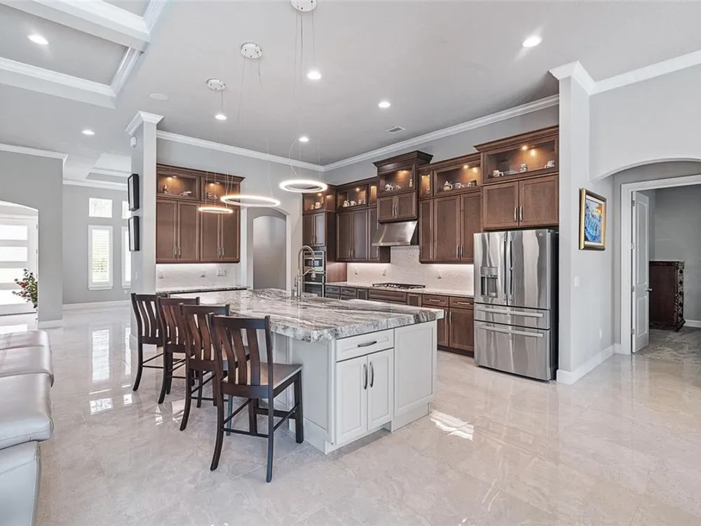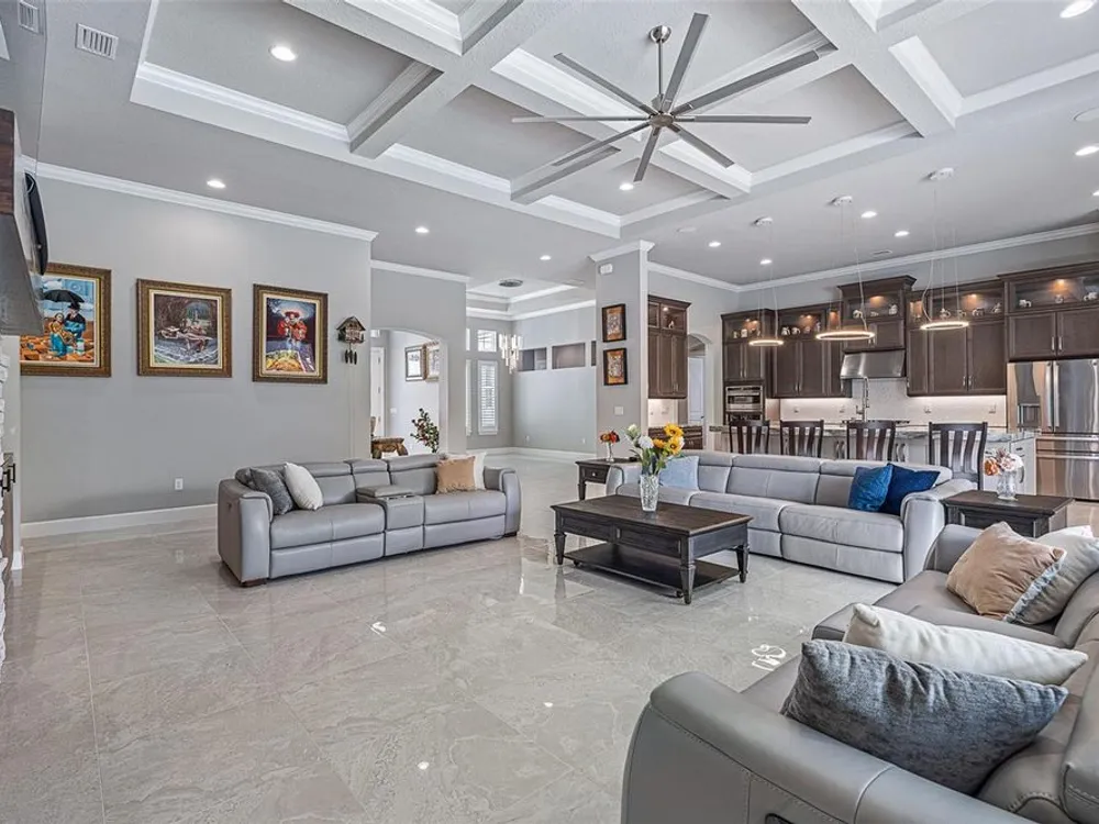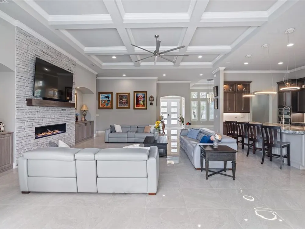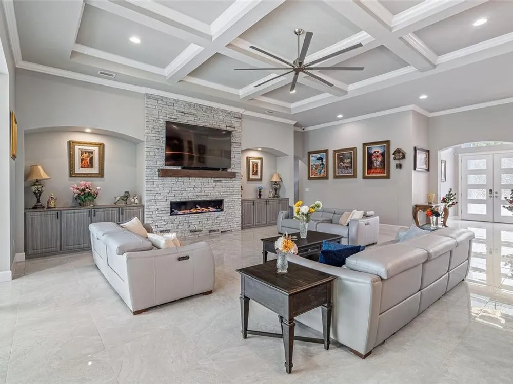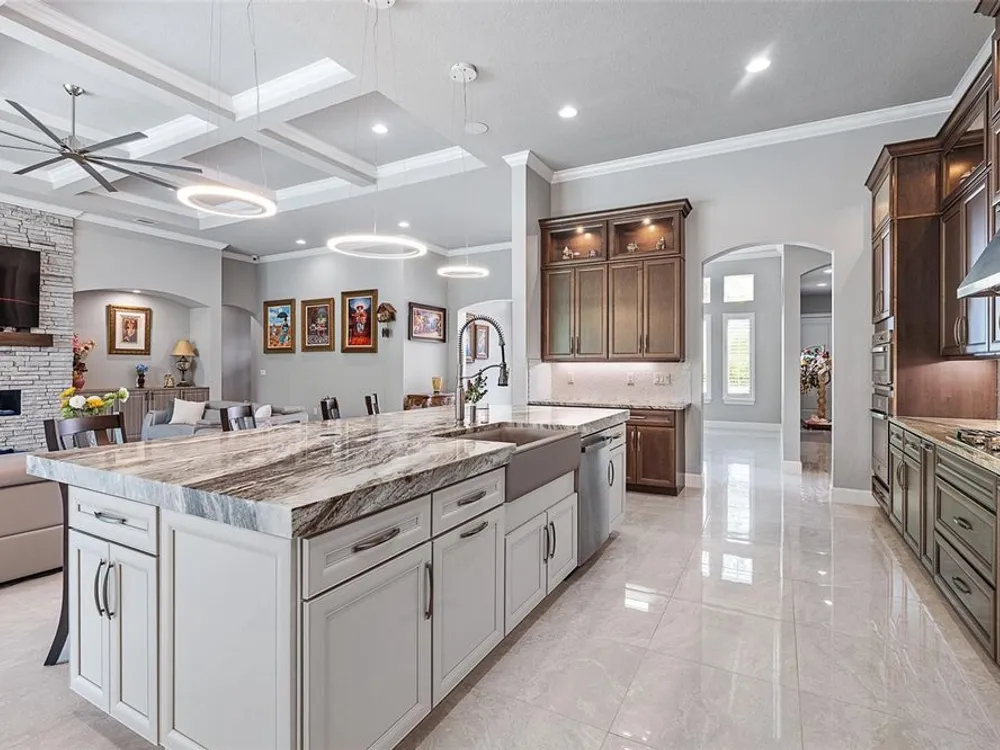 - Built-in Features, Ceiling Fan(s), Coffered Ceiling(s), Crown Molding, Eat-in Kitchen, High Ceilings, Kitchen/Family Room Combo, Open Floorplan, Main Level Primary, Solid Surface Counters, Solid-Wood Cabinets, Split Bedrooms, Stone Counters, Thermostat, Tray Ceiling(s), Walk-In Closet(s), Window Treatments