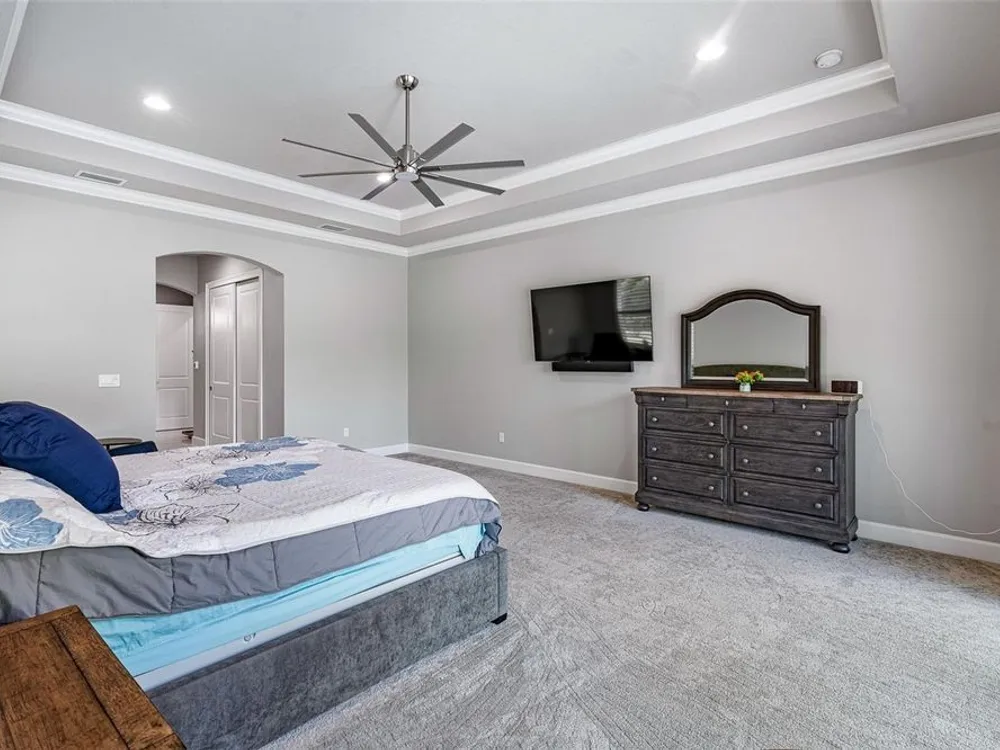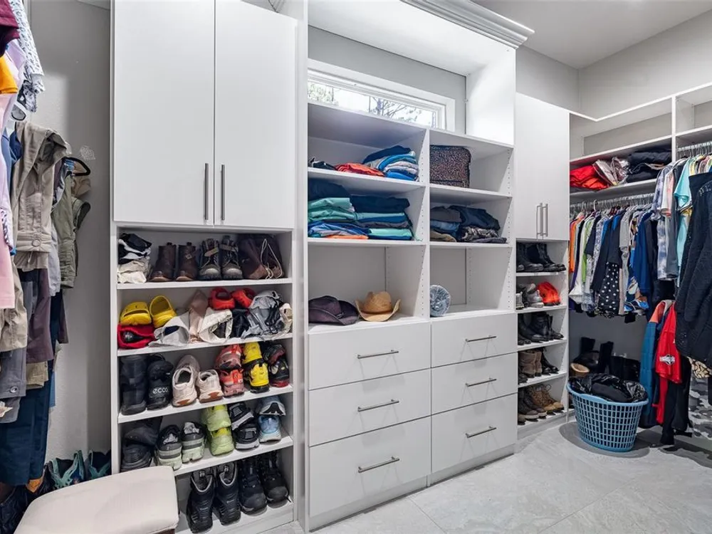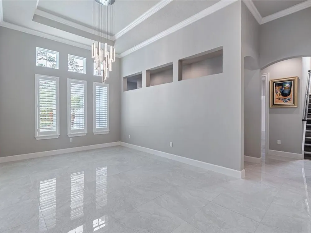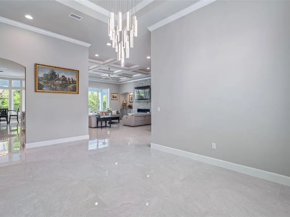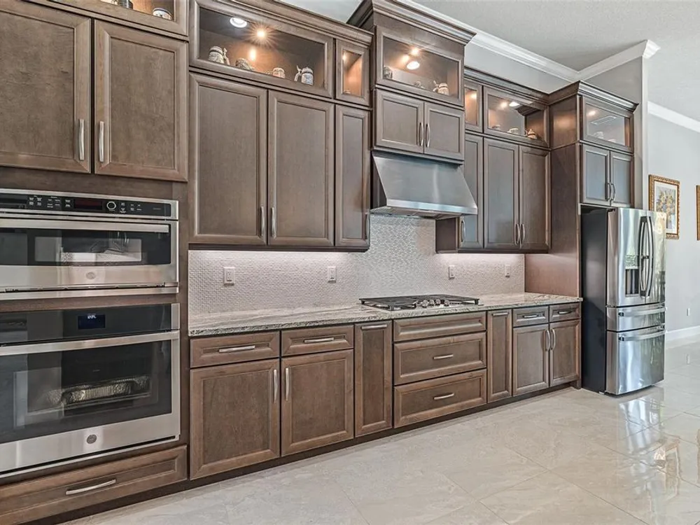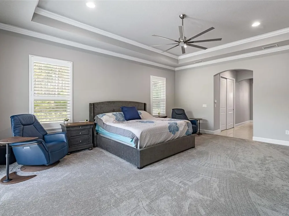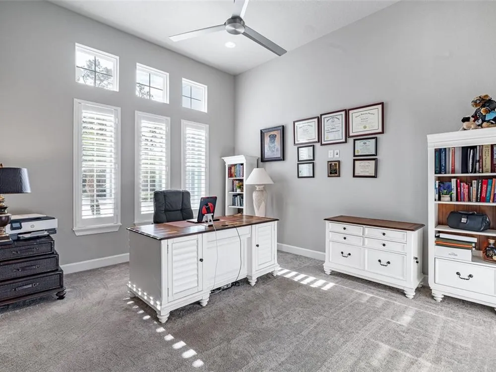 - Built-in Features, Ceiling Fan(s), Coffered Ceiling(s), Crown Molding, Eat-in Kitchen, High Ceilings, Kitchen/Family Room Combo, Open Floorplan, Main Level Primary, Solid Surface Counters, Solid-Wood Cabinets, Split Bedrooms, Stone Counters, Thermostat, Tray Ceiling(s), Walk-In Closet(s), Window Treatments