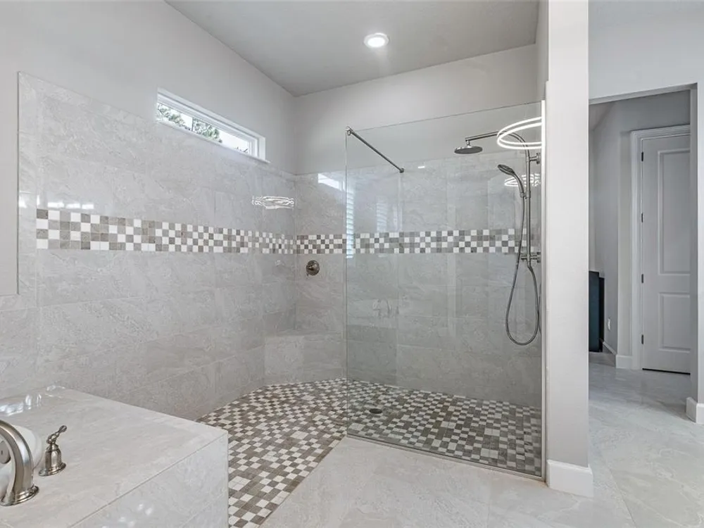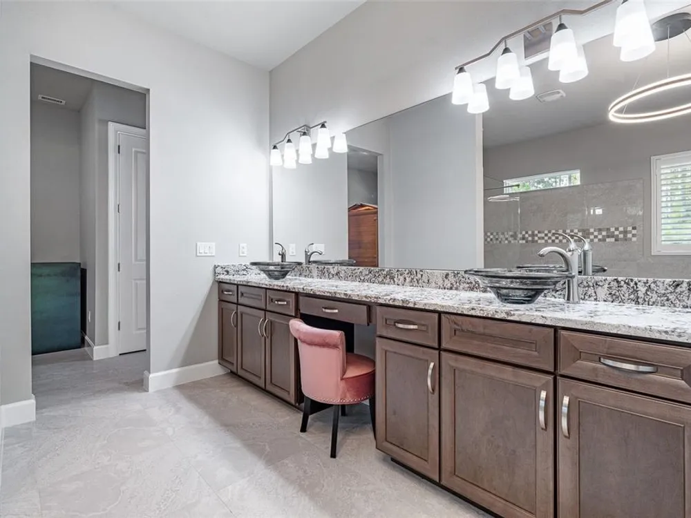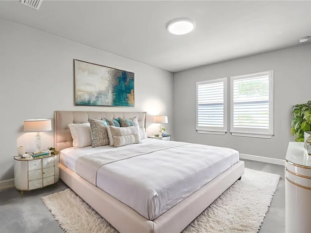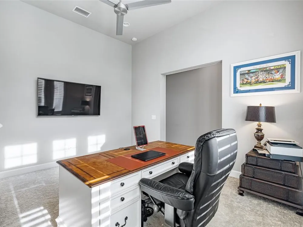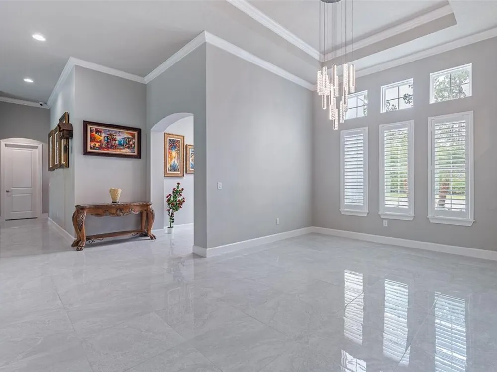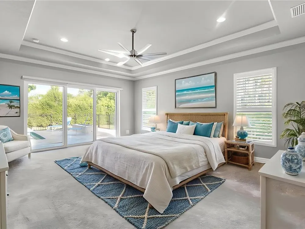 - Built-in Features, Ceiling Fan(s), Coffered Ceiling(s), Crown Molding, Eat-in Kitchen, High Ceilings, Kitchen/Family Room Combo, Open Floorplan, Main Level Primary, Solid Surface Counters, Solid-Wood Cabinets, Split Bedrooms, Stone Counters, Thermostat, Tray Ceiling(s), Walk-In Closet(s), Window Treatments