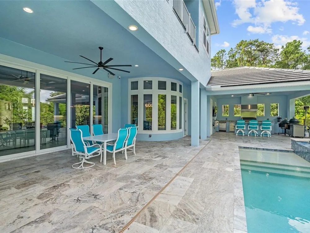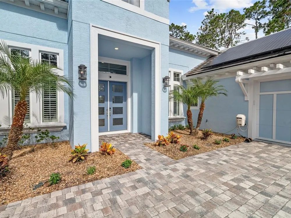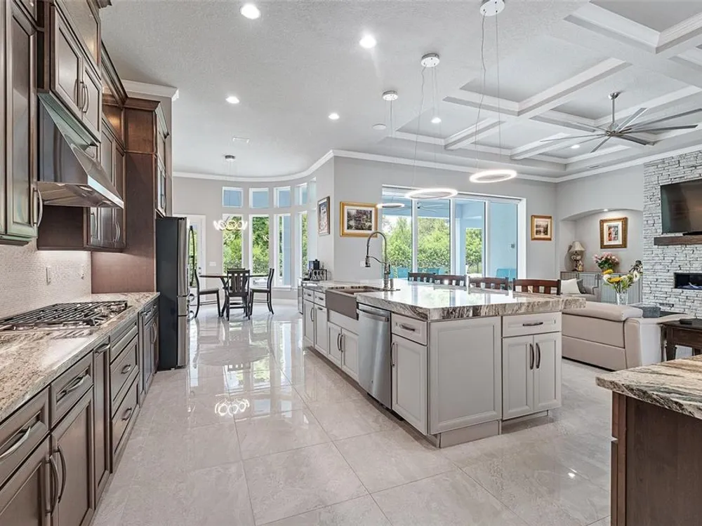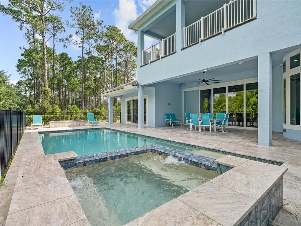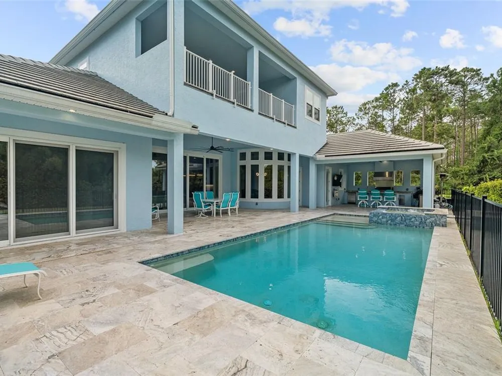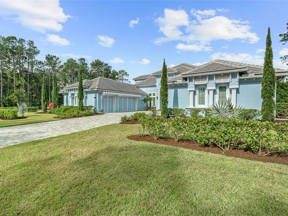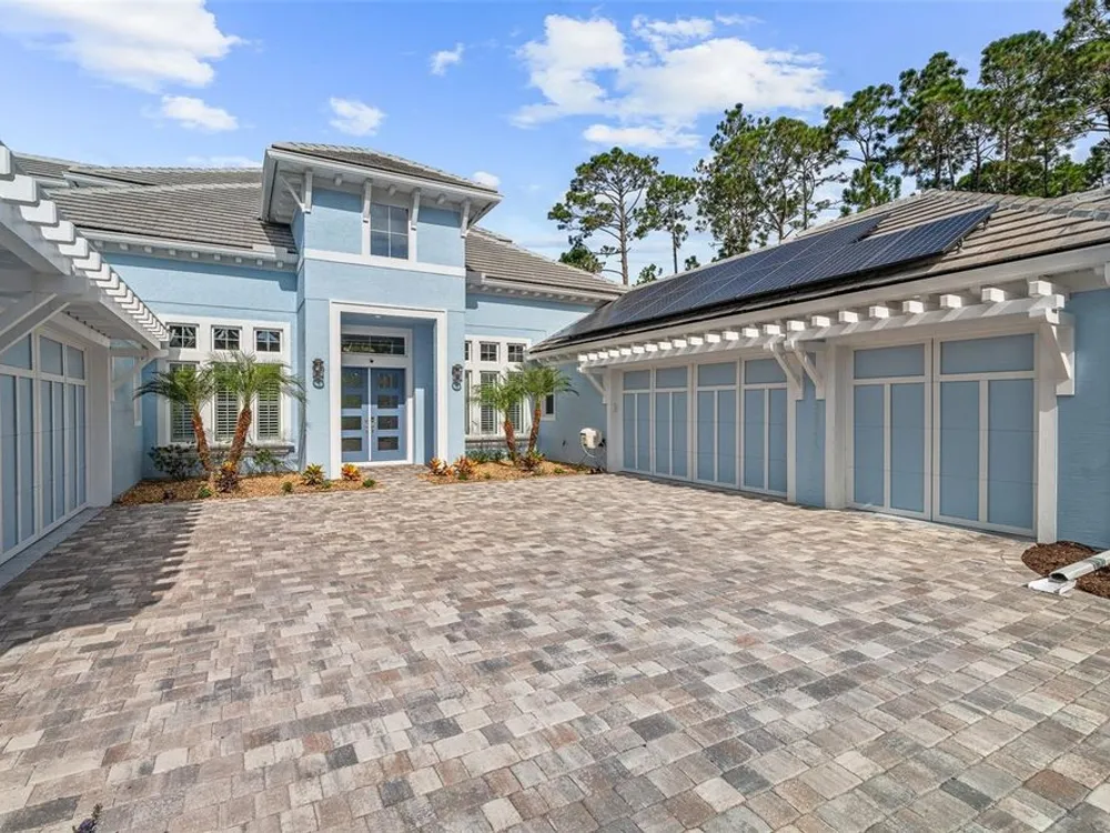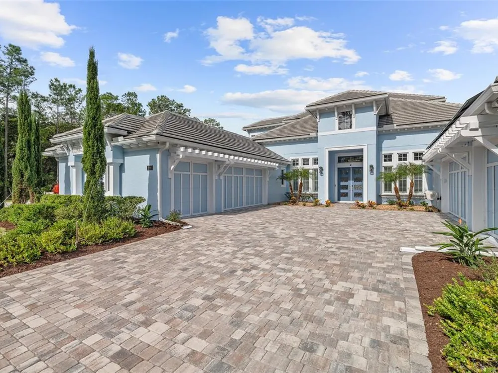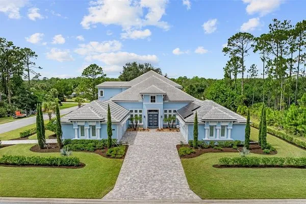 One or more photo(s) has been virtually staged. Stunning estate home offering an expansive 5,454 square feet of luxury living in the Plantation Bay fully SOLAR POWERED. Perfectly situated on a private corner lot of over half an acre, featuring 5 bedrooms, office, loft, bonus room, and 4 full baths, along with a rare 6+ car garage. Enter into a grand foyer adorned with a crystal chandelier & crown molding. The family room boasts soaring coffered ceilings, custom built-ins, and a striking linear gas fireplace set on a full stone wall, with four vanishing sliders that seamlessly open to the lanai with electric blinds. The gourmet kitchen showcases granite countertops, double-stacked cabinetry, GE Profile stainless steel appliances including gas range & convection oven, an oversized drop-edge granite island with charging towers, walk-in pantry, and storage features such as pull-out spice racks & two-tone cabinetry. A breakfast nook with rounded windows overlooks the pool & the formal dining room is appointed with porcelain tile floors, crown molding, tray ceiling, & crystal chandelier. The expansive primary suite offers a private foyer entrance, crown molding, plantation shutters, triple sliders with electric blinds to the lanai, and dual custom walk-in closets. The master bath features dual floating vanities with granite, a soaking tub, walk-in shower, & private commode with electric bidet. A private exercise room/sauna extends the suite's retreat. Bedroom 2,3,& 4 are all on the first floor. Each with custom closets & electric blinds, Bedroom 4 featuring en-suite bath with lanai access. Upstairs, a loft/library space leads to a massive bonus room with theater setup, triple sliders to a private balcony, and full bath connecting to the fifth bedroom with walk-in closet & balcony access. 2nd story balcony features pavers and expansive bird's eye views of the pool and yard. The outdoor living space is an entertainer's paradise, with extended pool & elevated spa with LED lighting, travertine decking, & remote-control systems. A full cabana kitchen includes a grill, sink, cabinetry, beverage fridges, fire pit, all overlooking the private backyard with lush landscaping for ultimate privacy. Fully fenced in yard, anchored on a corner lot with privacy hedges surrounding the home. This home has full house solar creating the ultimate energy efficiency and excellent cost of living. Additional highlights include 10'-14' ceilings, custom closet systems throughout, Control4 home automation with integrated lighting/audio/security, propane tank on remote for range/grill/heater on jacuzzi/fireplace/firepit, tile roof, gutters system, whole house generator, whole house water filtration system, extensive camera system, custom light fixtures throughout, expansive built-ins, excellent storage with 2 large storage closets, and pavers driveway surrounded by manicured privacy hedges, plus more. All located in GATED, golf cart friendly community of Plantation Bay with optional memberships available. Membership to include 45 hole of private golf, 9 tennis courts, 10 pickleball courts, new 30 million dollar Founders Clubhouse, additional Prestwick Clubhouse, fitness/spa center, 2 pools with cabana bar & grill, full events calendar, plus more! Buyers of this home to receive substantial discount on initiation fee at the club. Ask listing agent for details. This remarkable residence embodies the true essence of estate living-grand in scale, rich in detail, and designed for both family comfort and entertainment.