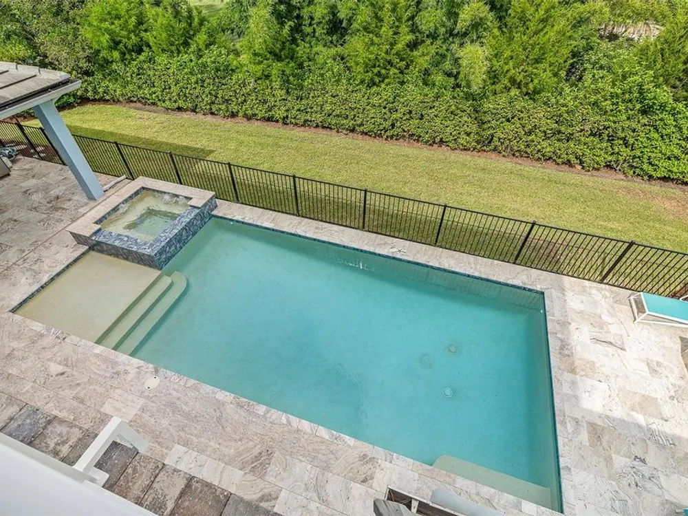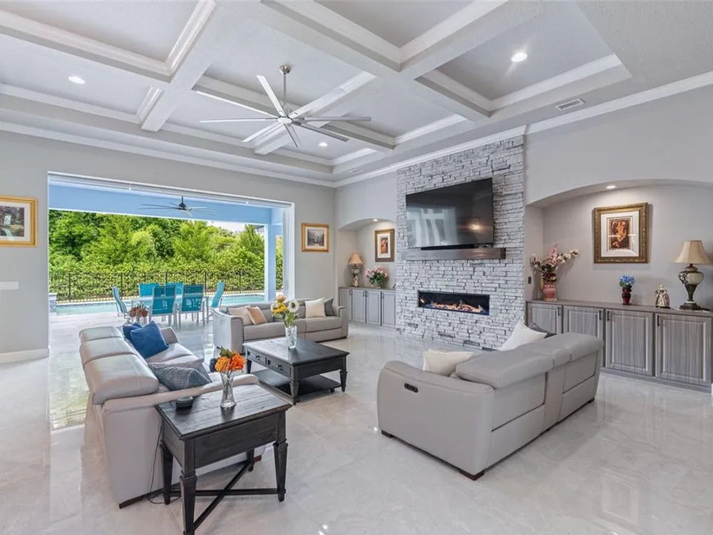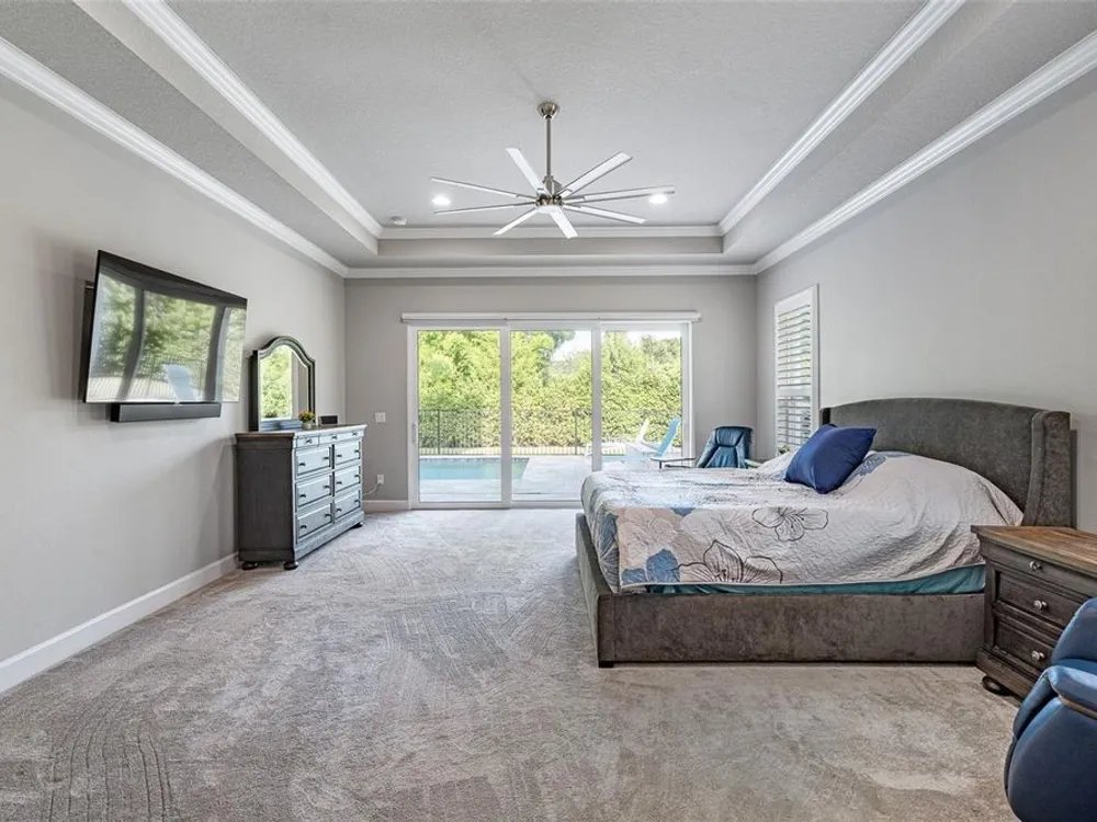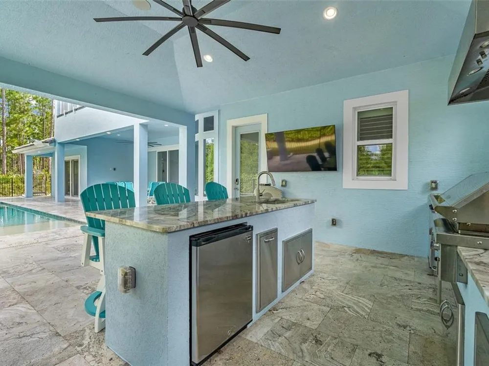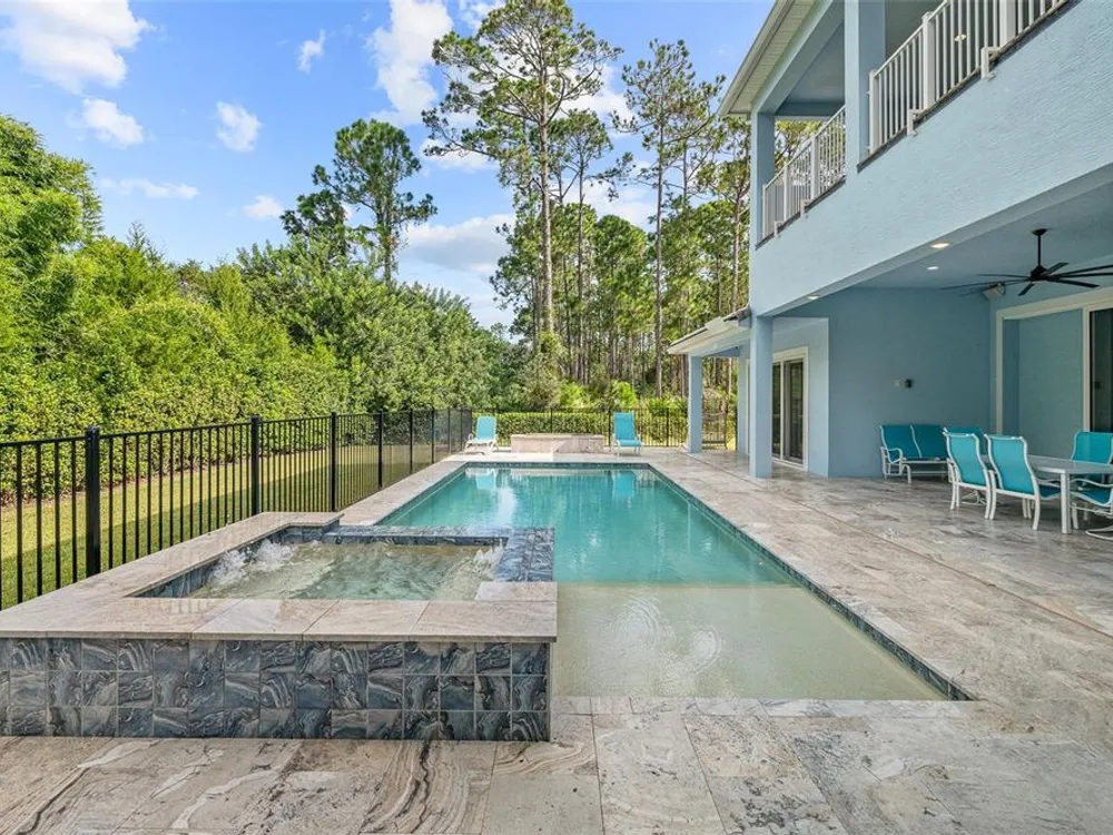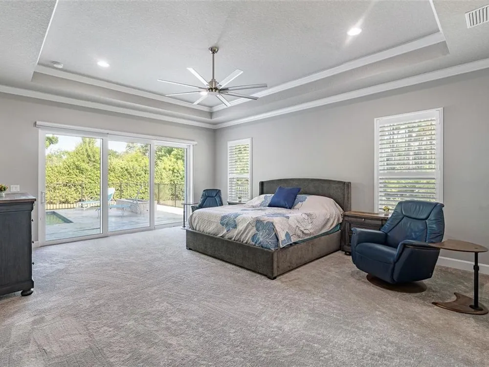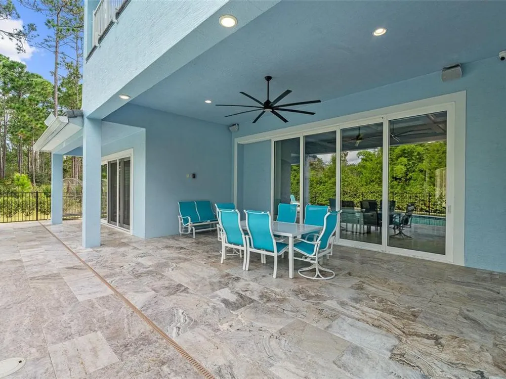 One or more photo(s) has been virtually staged. Stunning estate home offering an expansive 5,454 square feet of luxury living in the Plantation Bay fully SOLAR POWERED. Perfectly situated on a private corner lot of over half an acre, featuring 5 bedrooms, office, loft, bonus room, and 4 full baths, along with a rare 6+ car garage. Enter into a grand foyer adorned with a crystal chandelier & crown molding. The family room boasts soaring coffered ceilings, custom built-ins, and a striking linear gas fireplace set on a full stone wall, with four vanishing sliders that seamlessly open to the lanai with electric blinds. The gourmet kitchen showcases granite countertops, double-stacked cabinetry, GE Profile stainless steel appliances including gas range & convection oven, an oversized drop-edge granite island with charging towers, walk-in pantry, and storage features such as pull-out spice racks & two-tone cabinetry. A breakfast nook with rounded windows overlooks the pool & the formal dining room is appointed with porcelain tile floors, crown molding, tray ceiling, & crystal chandelier. The expansive primary suite offers a private foyer entrance, crown molding, plantation shutters, triple sliders with electric blinds to the lanai, and dual custom walk-in closets. The master bath features dual floating vanities with granite, a soaking tub, walk-in shower, & private commode with electric bidet. A private exercise room/sauna extends the suite's retreat. Bedroom 2,3,& 4 are all on the first floor. Each with custom closets & electric blinds, Bedroom 4 featuring en-suite bath with lanai access. Upstairs, a loft/library space leads to a massive bonus room with theater setup, triple sliders to a private balcony, and full bath connecting to the fifth bedroom with walk-in closet & balcony access. 2nd story balcony features pavers and expansive bird's eye views of the pool and yard. The outdoor living space is an entertainer's paradise, with extended pool & elevated spa with LED lighting, travertine decking, & remote-control systems. A full cabana kitchen includes a grill, sink, cabinetry, beverage fridges, fire pit, all overlooking the private backyard with lush landscaping for ultimate privacy. Fully fenced in yard, anchored on a corner lot with privacy hedges surrounding the home. This home has full house solar creating the ultimate energy efficiency and excellent cost of living. Additional highlights include 10'-14' ceilings, custom closet systems throughout, Control4 home automation with integrated lighting/audio/security, propane tank on remote for range/grill/heater on jacuzzi/fireplace/firepit, tile roof, gutters system, whole house generator, whole house water filtration system, extensive camera system, custom light fixtures throughout, expansive built-ins, excellent storage with 2 large storage closets, and pavers driveway surrounded by manicured privacy hedges, plus more. All located in GATED, golf cart friendly community of Plantation Bay with optional memberships available. Membership to include 45 hole of private golf, 9 tennis courts, 10 pickleball courts, new 30 million dollar Founders Clubhouse, additional Prestwick Clubhouse, fitness/spa center, 2 pools with cabana bar & grill, full events calendar, plus more! Buyers of this home to receive substantial discount on initiation fee at the club. Ask listing agent for details. This remarkable residence embodies the true essence of estate living-grand in scale, rich in detail, and designed for both family comfort and entertainment.