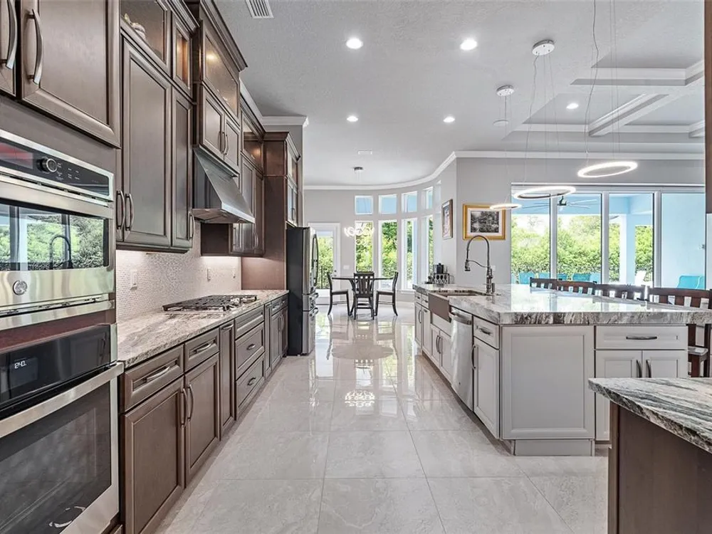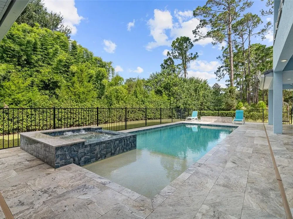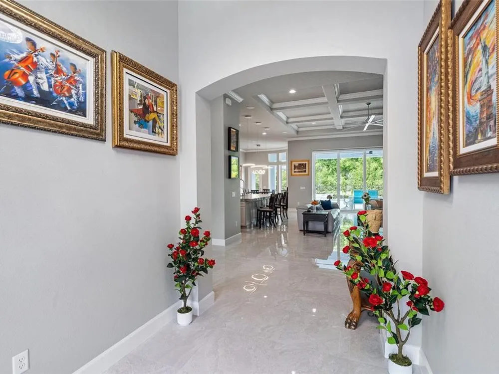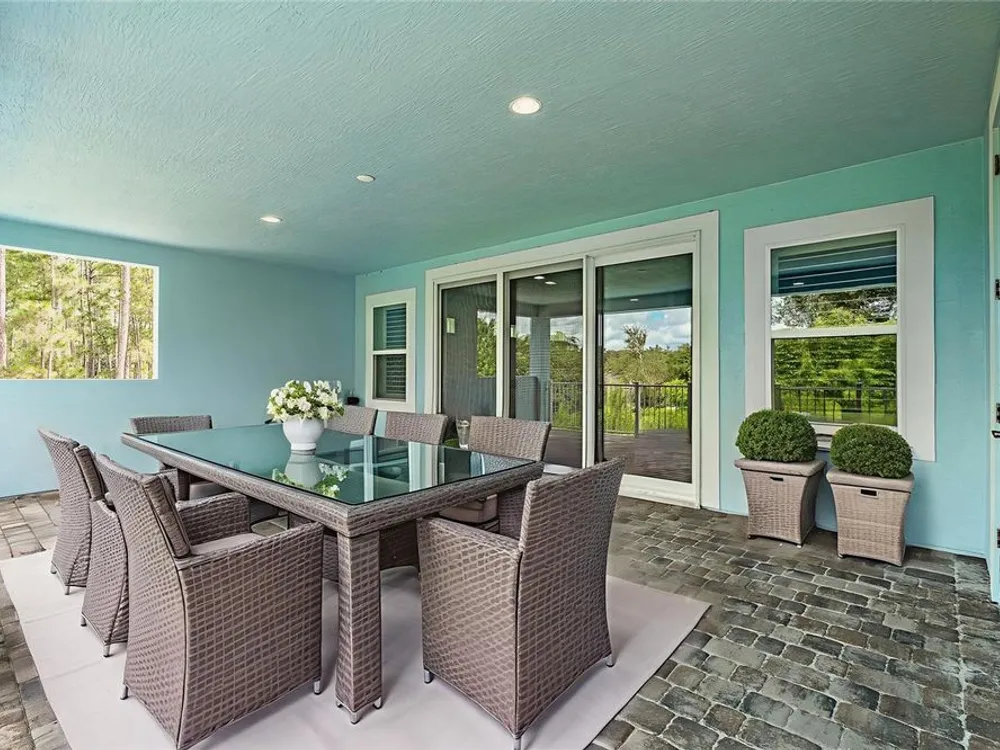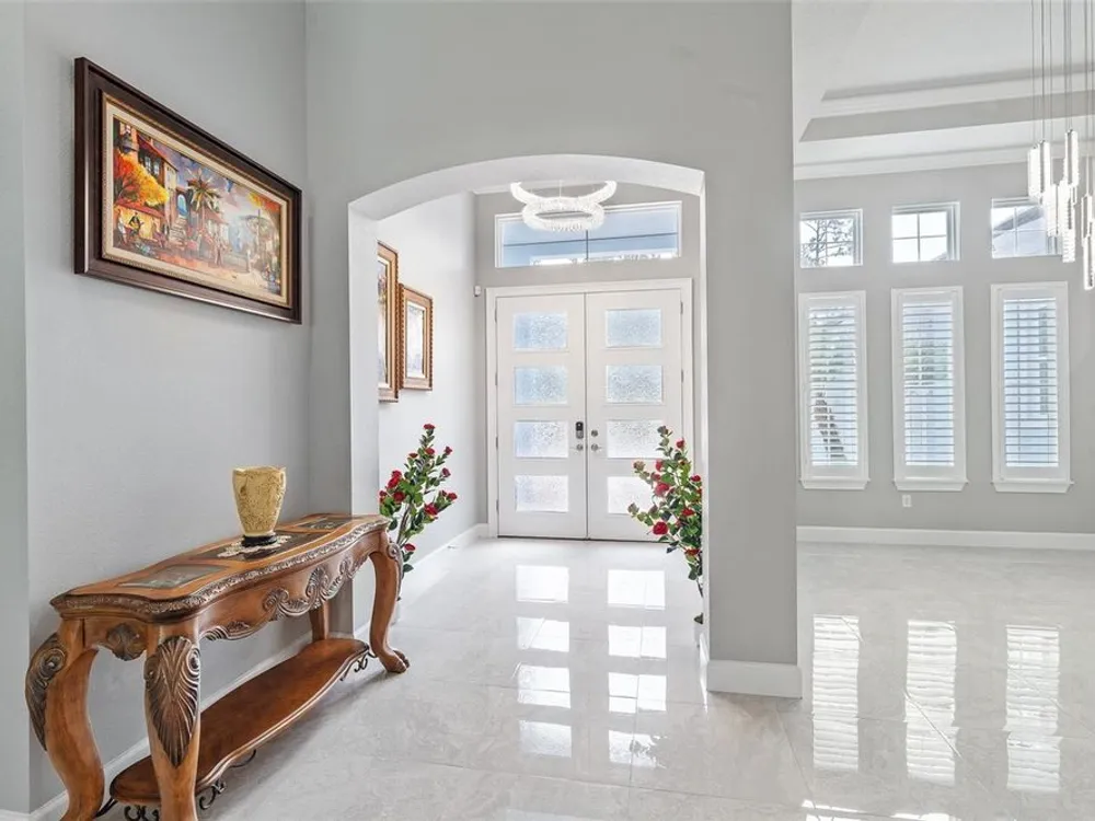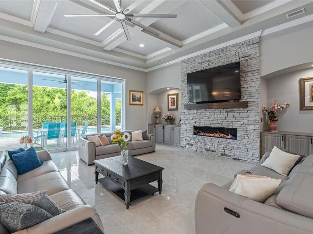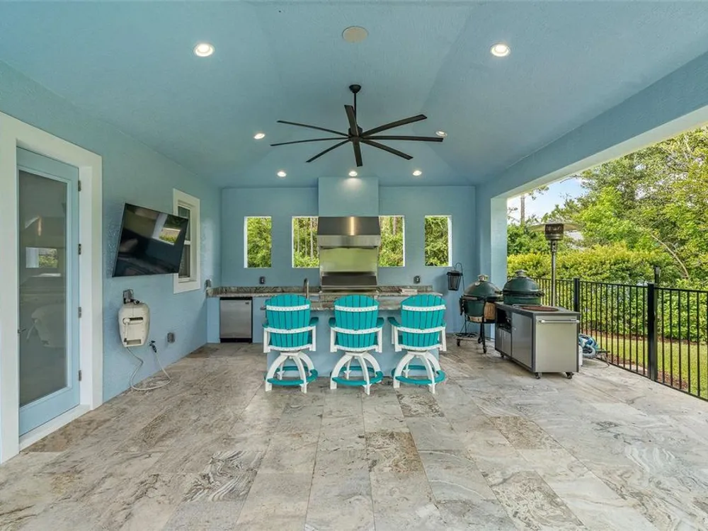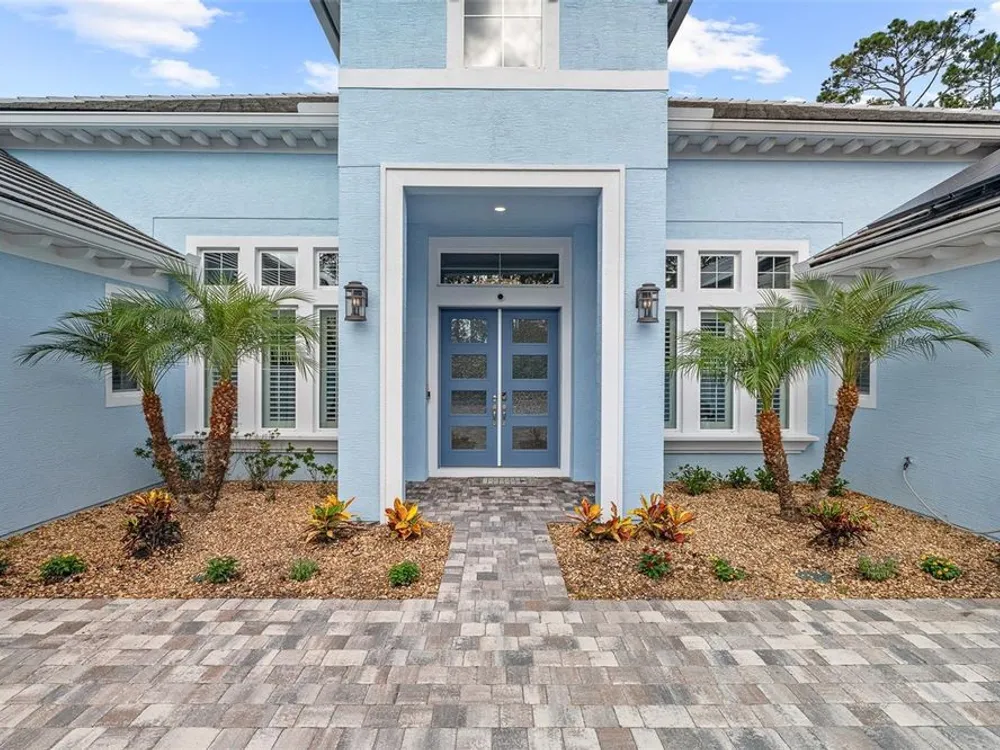 One or more photo(s) has been virtually staged. Stunning estate home offering an expansive 5,454 square feet of luxury living in the Plantation Bay fully SOLAR POWERED. Perfectly situated on a private corner lot of over half an acre, featuring 5 bedrooms, office, loft, bonus room, and 4 full baths, along with a rare 6+ car garage. Enter into a grand foyer adorned with a crystal chandelier & crown molding. The family room boasts soaring coffered ceilings, custom built-ins, and a striking linear gas fireplace set on a full stone wall, with four vanishing sliders that seamlessly open to the lanai with electric blinds. The gourmet kitchen showcases granite countertops, double-stacked cabinetry, GE Profile stainless steel appliances including gas range & convection oven, an oversized drop-edge granite island with charging towers, walk-in pantry, and storage features such as pull-out spice racks & two-tone cabinetry. A breakfast nook with rounded windows overlooks the pool & the formal dining room is appointed with porcelain tile floors, crown molding, tray ceiling, & crystal chandelier. The expansive primary suite offers a private foyer entrance, crown molding, plantation shutters, triple sliders with electric blinds to the lanai, and dual custom walk-in closets. The master bath features dual floating vanities with granite, a soaking tub, walk-in shower, & private commode with electric bidet. A private exercise room/sauna extends the suite's retreat. Bedroom 2,3,& 4 are all on the first floor. Each with custom closets & electric blinds, Bedroom 4 featuring en-suite bath with lanai access. Upstairs, a loft/library space leads to a massive bonus room with theater setup, triple sliders to a private balcony, and full bath connecting to the fifth bedroom with walk-in closet & balcony access. 2nd story balcony features pavers and expansive bird's eye views of the pool and yard. The outdoor living space is an entertainer's paradise, with extended pool & elevated spa with LED lighting, travertine decking, & remote-control systems. A full cabana kitchen includes a grill, sink, cabinetry, beverage fridges, fire pit, all overlooking the private backyard with lush landscaping for ultimate privacy. Fully fenced in yard, anchored on a corner lot with privacy hedges surrounding the home. This home has full house solar creating the ultimate energy efficiency and excellent cost of living. Additional highlights include 10'-14' ceilings, custom closet systems throughout, Control4 home automation with integrated lighting/audio/security, propane tank on remote for range/grill/heater on jacuzzi/fireplace/firepit, tile roof, gutters system, whole house generator, whole house water filtration system, extensive camera system, custom light fixtures throughout, expansive built-ins, excellent storage with 2 large storage closets, and pavers driveway surrounded by manicured privacy hedges, plus more. All located in GATED, golf cart friendly community of Plantation Bay with optional memberships available. Membership to include 45 hole of private golf, 9 tennis courts, 10 pickleball courts, new 30 million dollar Founders Clubhouse, additional Prestwick Clubhouse, fitness/spa center, 2 pools with cabana bar & grill, full events calendar, plus more! Buyers of this home to receive substantial discount on initiation fee at the club. Ask listing agent for details. This remarkable residence embodies the true essence of estate living-grand in scale, rich in detail, and designed for both family comfort and entertainment.