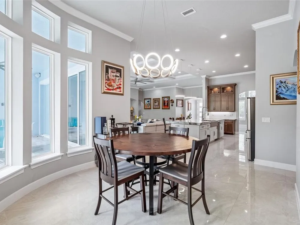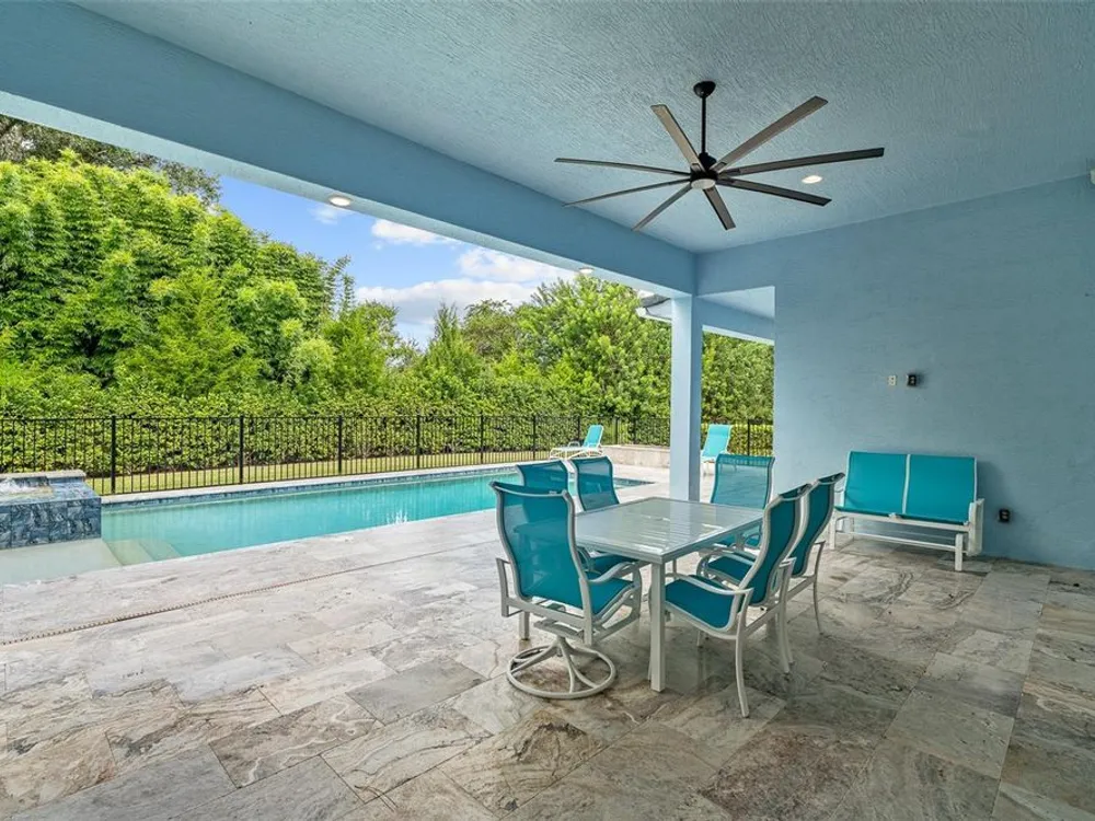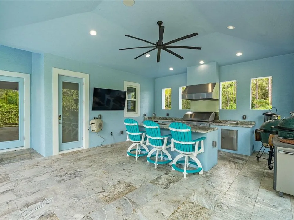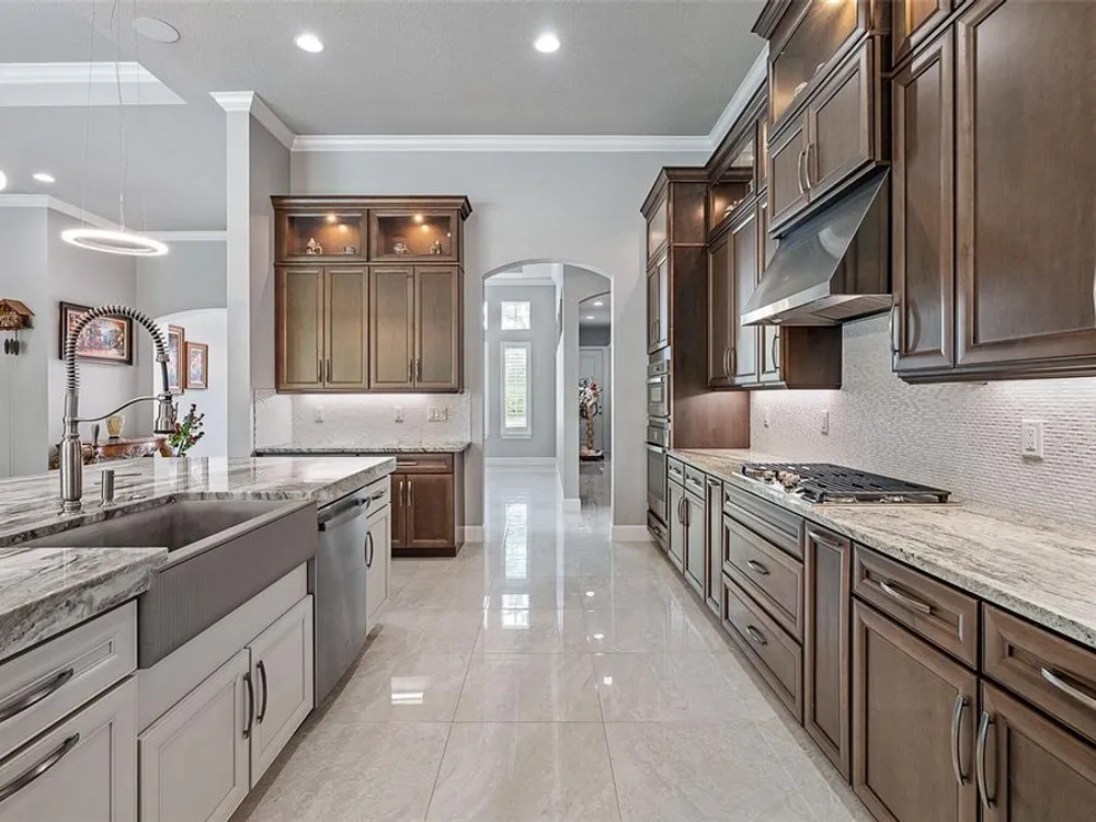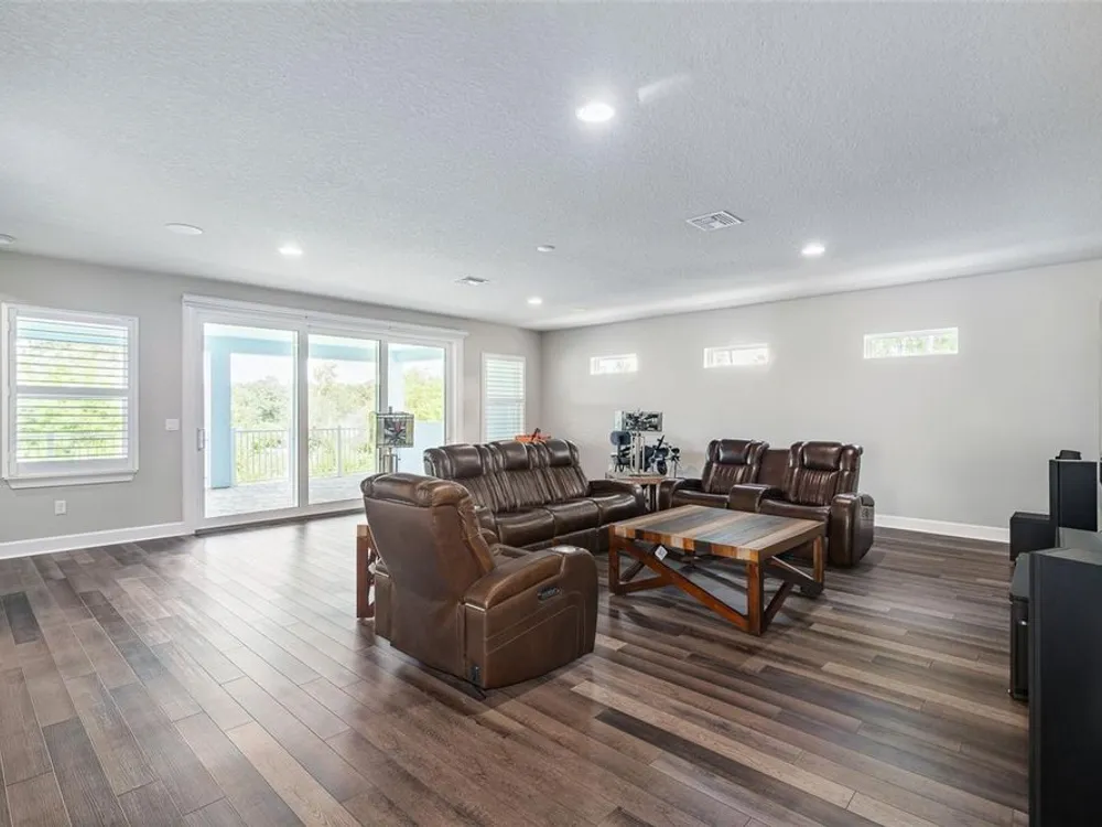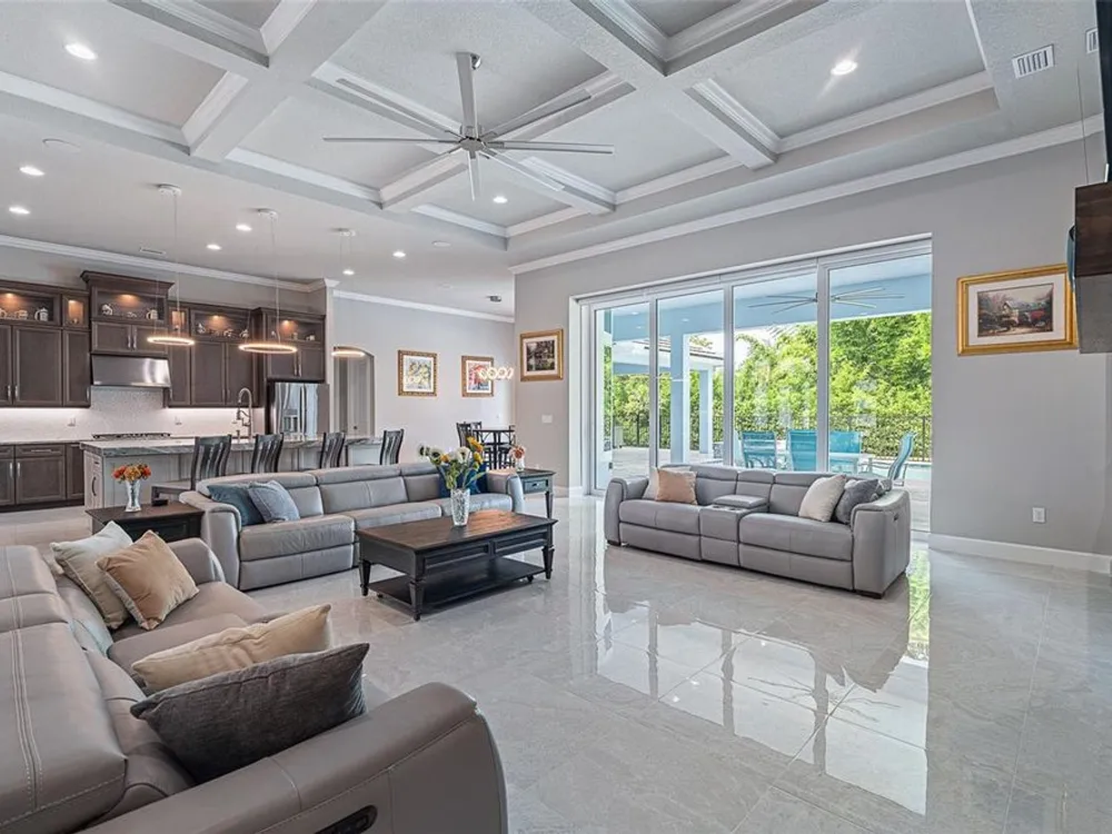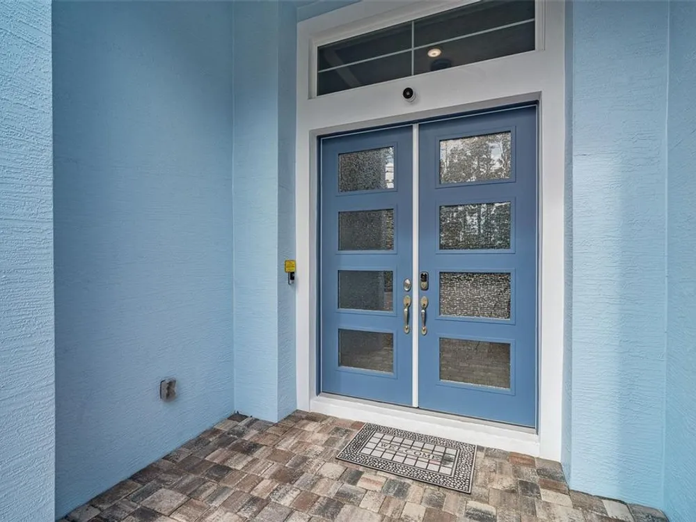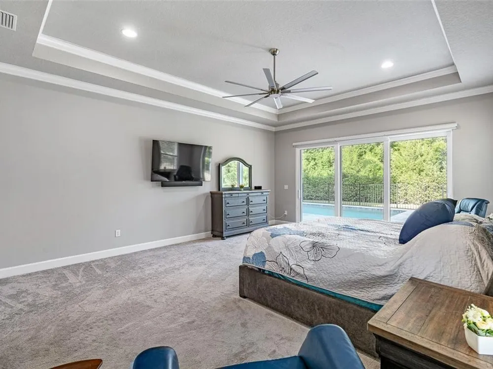 One or more photo(s) has been virtually staged. Stunning estate home offering an expansive 5,454 square feet of luxury living in the Plantation Bay fully SOLAR POWERED. Perfectly situated on a private corner lot of over half an acre, featuring 5 bedrooms, office, loft, bonus room, and 4 full baths, along with a rare 6+ car garage. Enter into a grand foyer adorned with a crystal chandelier & crown molding. The family room boasts soaring coffered ceilings, custom built-ins, and a striking linear gas fireplace set on a full stone wall, with four vanishing sliders that seamlessly open to the lanai with electric blinds. The gourmet kitchen showcases granite countertops, double-stacked cabinetry, GE Profile stainless steel appliances including gas range & convection oven, an oversized drop-edge granite island with charging towers, walk-in pantry, and storage features such as pull-out spice racks & two-tone cabinetry. A breakfast nook with rounded windows overlooks the pool & the formal dining room is appointed with porcelain tile floors, crown molding, tray ceiling, & crystal chandelier. The expansive primary suite offers a private foyer entrance, crown molding, plantation shutters, triple sliders with electric blinds to the lanai, and dual custom walk-in closets. The master bath features dual floating vanities with granite, a soaking tub, walk-in shower, & private commode with electric bidet. A private exercise room/sauna extends the suite's retreat. Bedroom 2,3,& 4 are all on the first floor. Each with custom closets & electric blinds, Bedroom 4 featuring en-suite bath with lanai access. Upstairs, a loft/library space leads to a massive bonus room with theater setup, triple sliders to a private balcony, and full bath connecting to the fifth bedroom with walk-in closet & balcony access. 2nd story balcony features pavers and expansive bird's eye views of the pool and yard. The outdoor living space is an entertainer's paradise, with extended pool & elevated spa with LED lighting, travertine decking, & remote-control systems. A full cabana kitchen includes a grill, sink, cabinetry, beverage fridges, fire pit, all overlooking the private backyard with lush landscaping for ultimate privacy. Fully fenced in yard, anchored on a corner lot with privacy hedges surrounding the home. This home has full house solar creating the ultimate energy efficiency and excellent cost of living. Additional highlights include 10'-14' ceilings, custom closet systems throughout, Control4 home automation with integrated lighting/audio/security, propane tank on remote for range/grill/heater on jacuzzi/fireplace/firepit, tile roof, gutters system, whole house generator, whole house water filtration system, extensive camera system, custom light fixtures throughout, expansive built-ins, excellent storage with 2 large storage closets, and pavers driveway surrounded by manicured privacy hedges, plus more. All located in GATED, golf cart friendly community of Plantation Bay with optional memberships available. Membership to include 45 hole of private golf, 9 tennis courts, 10 pickleball courts, new 30 million dollar Founders Clubhouse, additional Prestwick Clubhouse, fitness/spa center, 2 pools with cabana bar & grill, full events calendar, plus more! Buyers of this home to receive substantial discount on initiation fee at the club. Ask listing agent for details. This remarkable residence embodies the true essence of estate living-grand in scale, rich in detail, and designed for both family comfort and entertainment.
