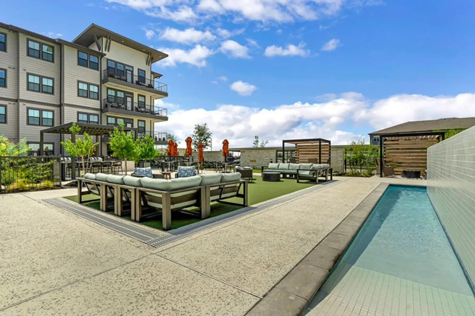 At Sage Plum Creek, you can enjoy amenities such as the Fitness Center, Gathering Areas, Outdoor Pool, Outdoor Patio, Fire Pit, Pickleball Courts, Bocce Ball Courts, BBQ, Gardening Plots, and Bikes/Bike Storage/Bike Rentals.